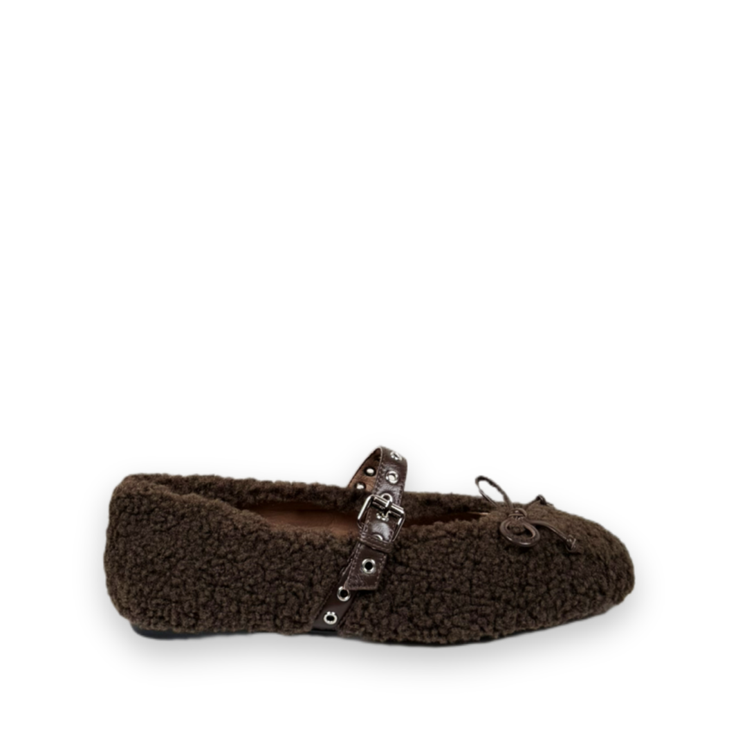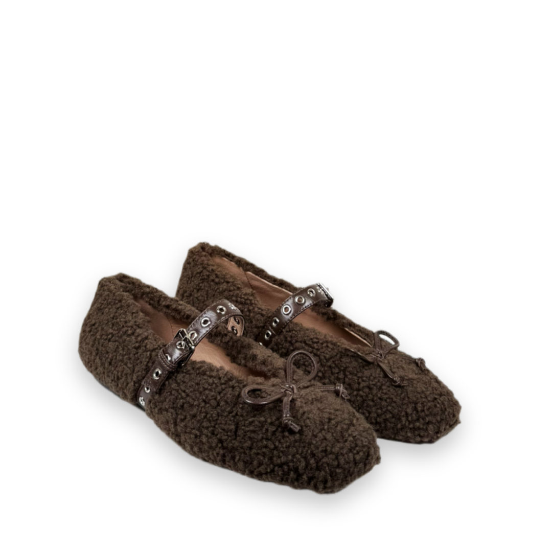 Deze zachte ballerina is uitgevoerd in bruin schaapswol en afgewerkt met een leren strikje en een leren verstelbaar bandje over de voet. Het model heeft een carré neus en is leer gevoerd.