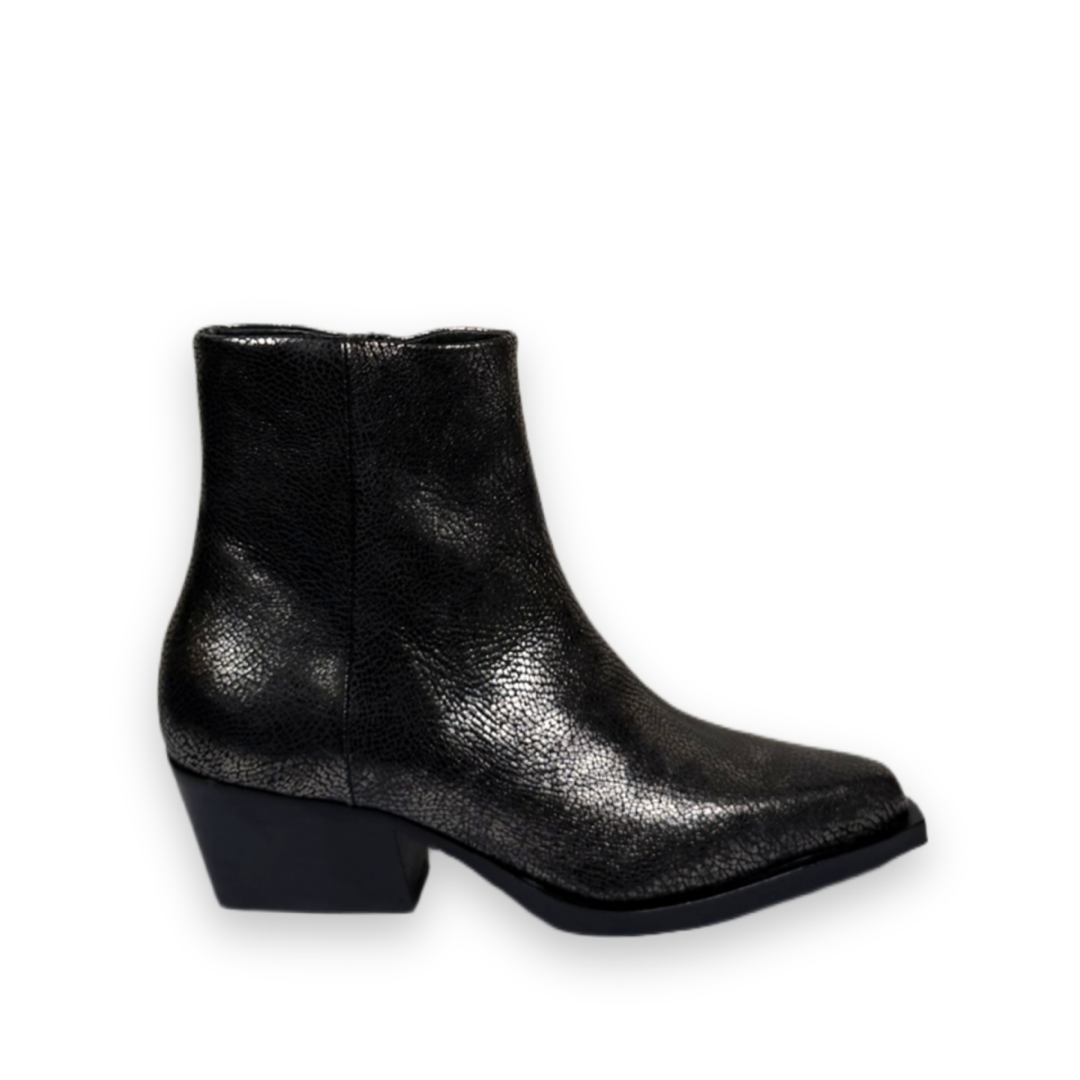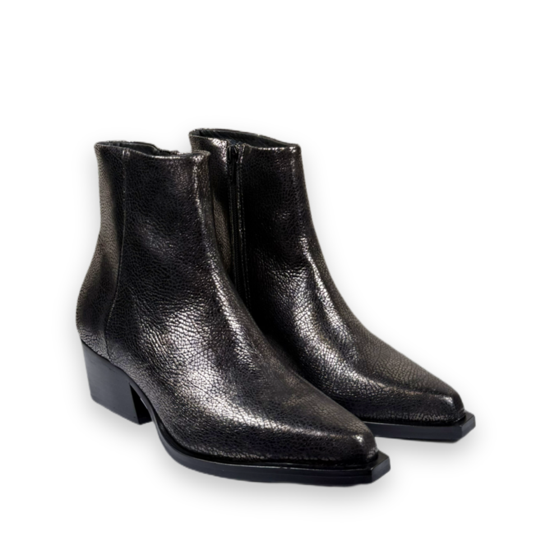 Dit laarsje was vorig jaar een echte bestseller, door de stoere look! Het model is dit najaar uitgevoerd in metallic leer en heeft een spitse neus en een kleine blokhak.