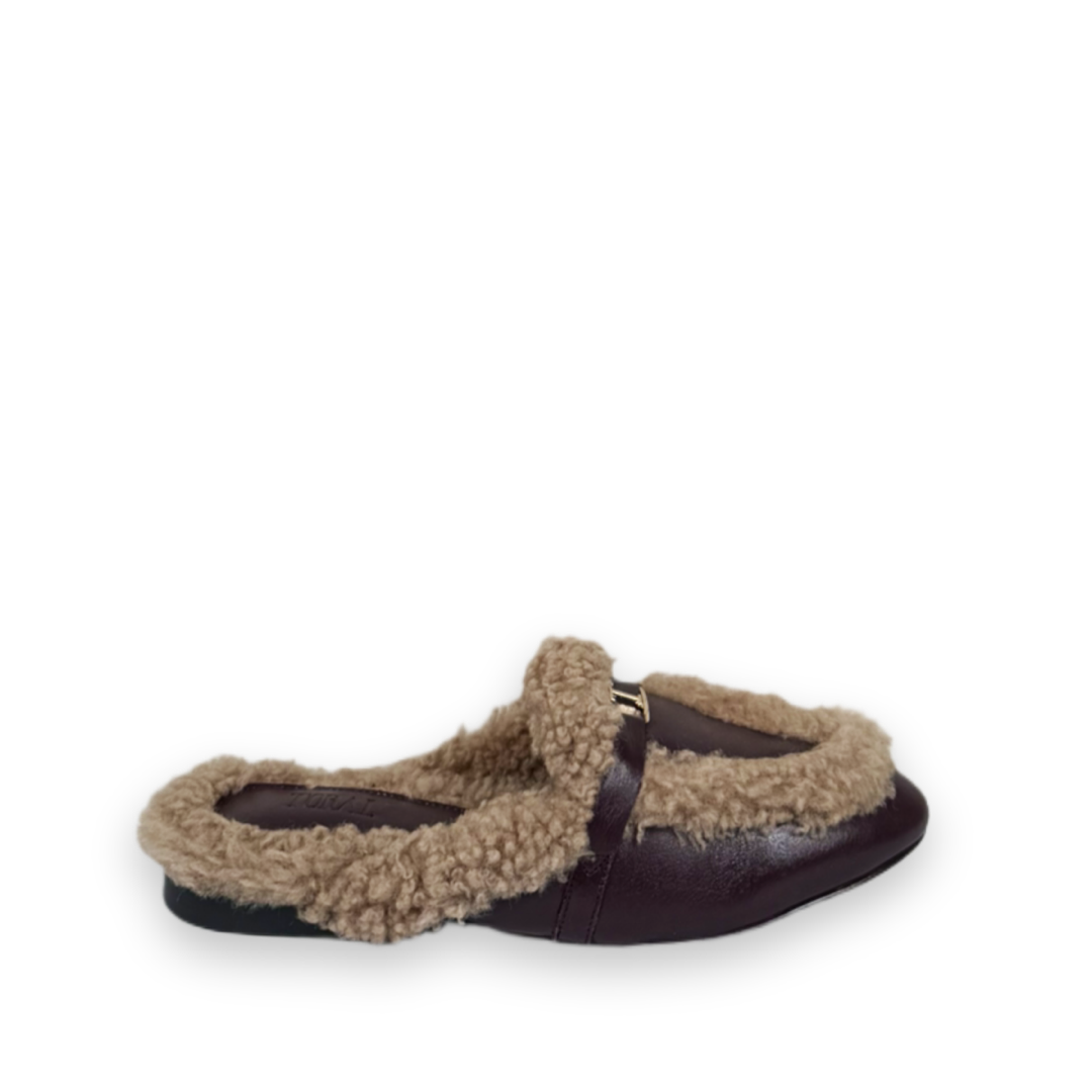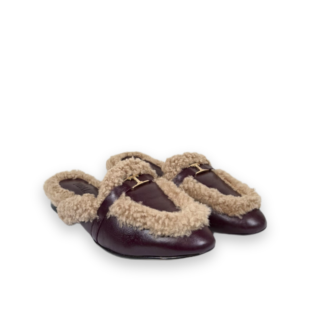 Deze berenzachte instapper is uitgevoerd in bodeaux leer en afgewerkt met bruin bont. Het model heeft een dichte neus en een open hiel. Over de voet loopt een subtiel detail met een gouden T.