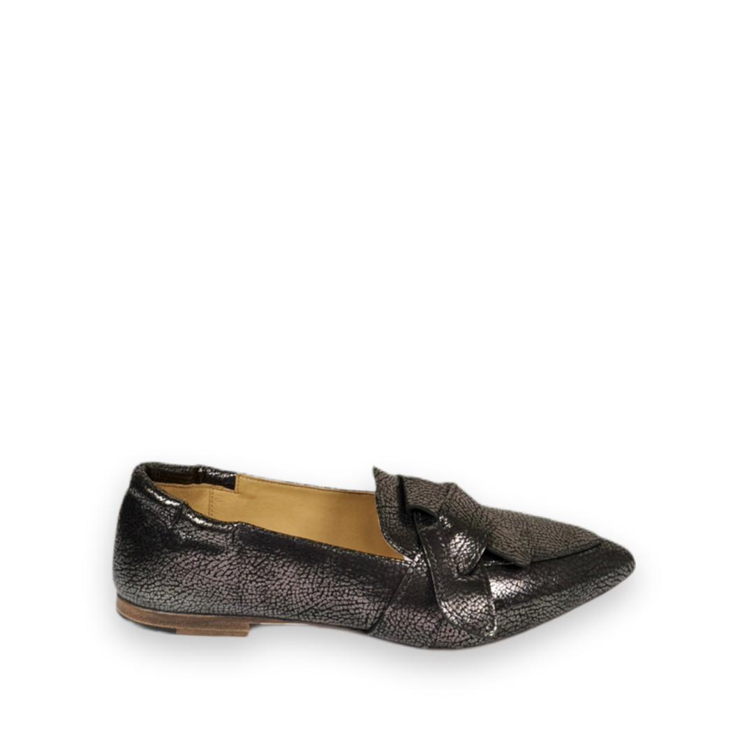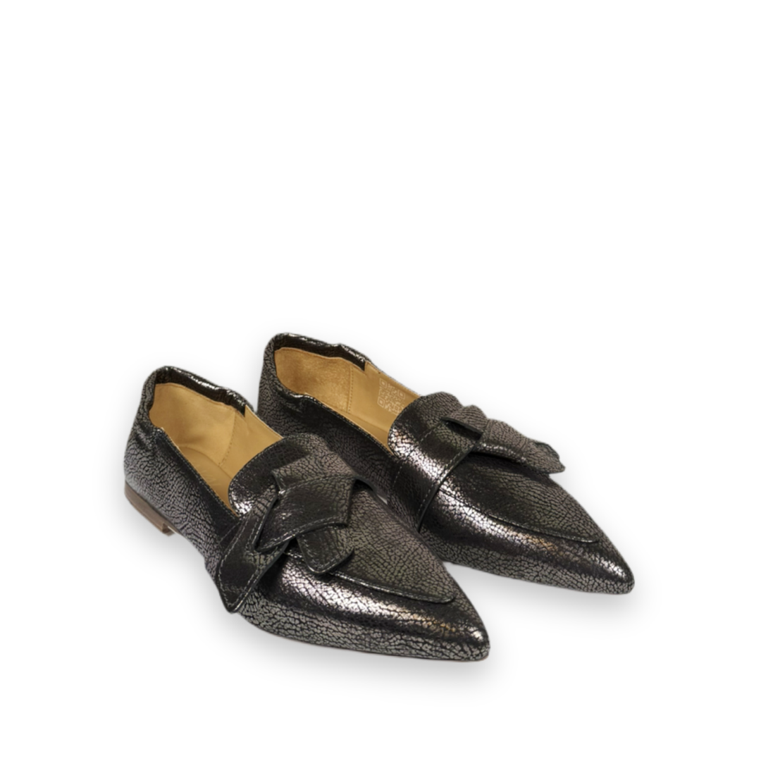 Deze bekende loafer is dit keer uitgevoerd in antraciet metallic craquelé leer. Het model heeft een spitse neus en een strik op voor voorkant. Door de elastiek achter sluit de ballerina altijd mooi aan de voet. Het voetbed is heerlijk zacht en uit ervaring is gebleken dat dit schoentje echt bij iedereen lekker zit!