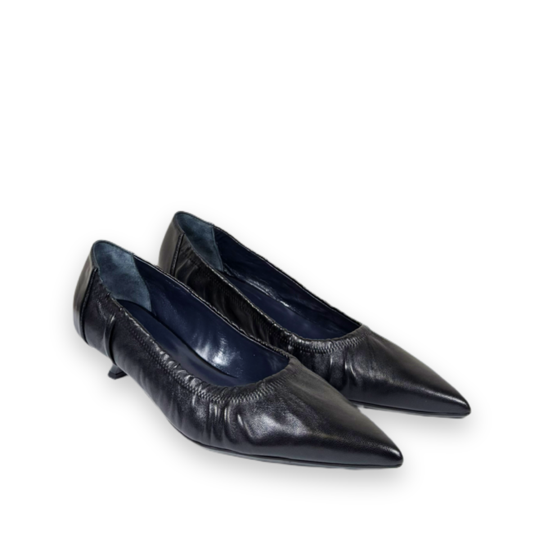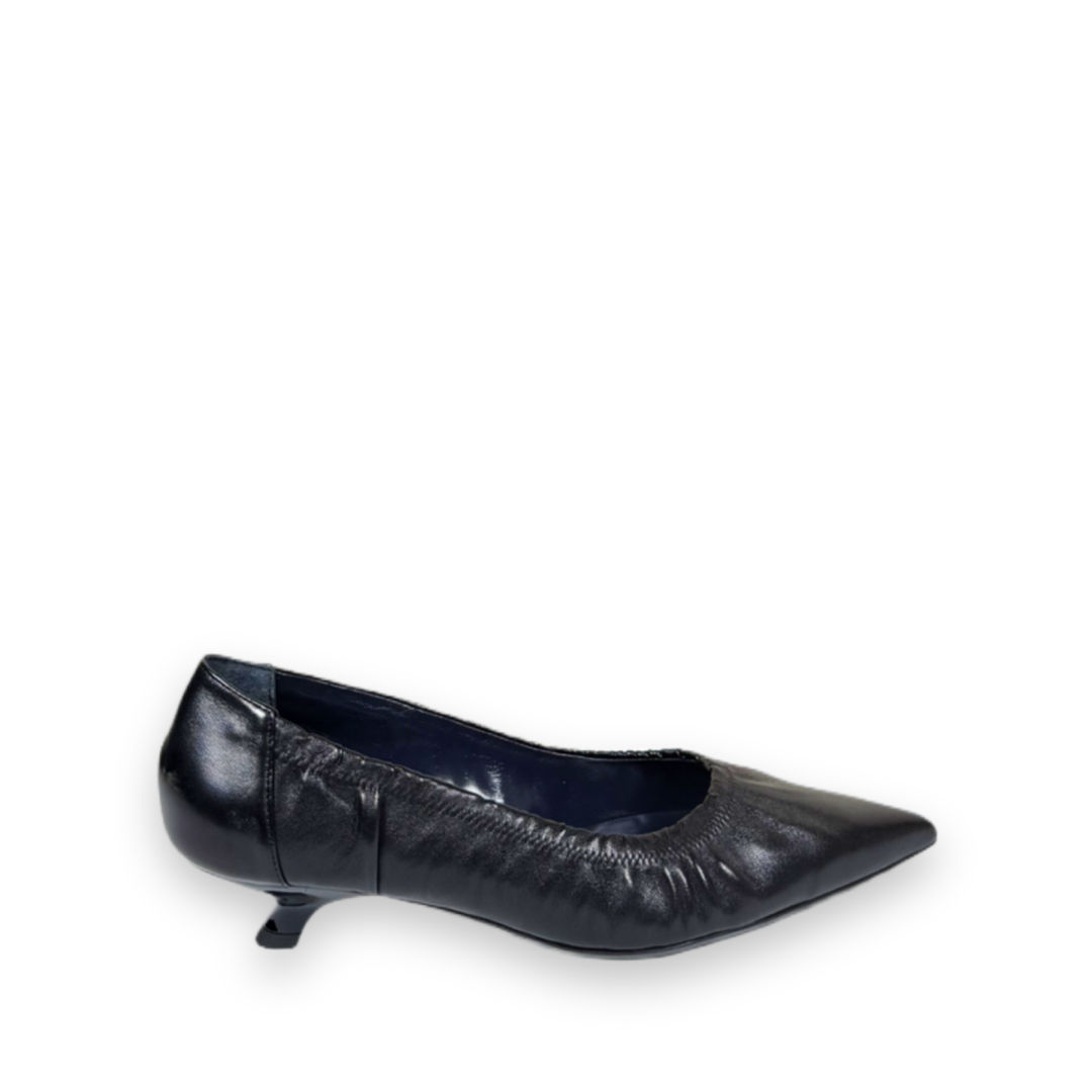 Deze luxe pump is gemaakt van zacht leer en heeft een spitse neus en een klein terugspringend zwart hakje. Het model is gesmokt (kleine rimpeltjes) voor een speels effect. Door het kleine hakje en de leren voering zit de pump als gegoten!