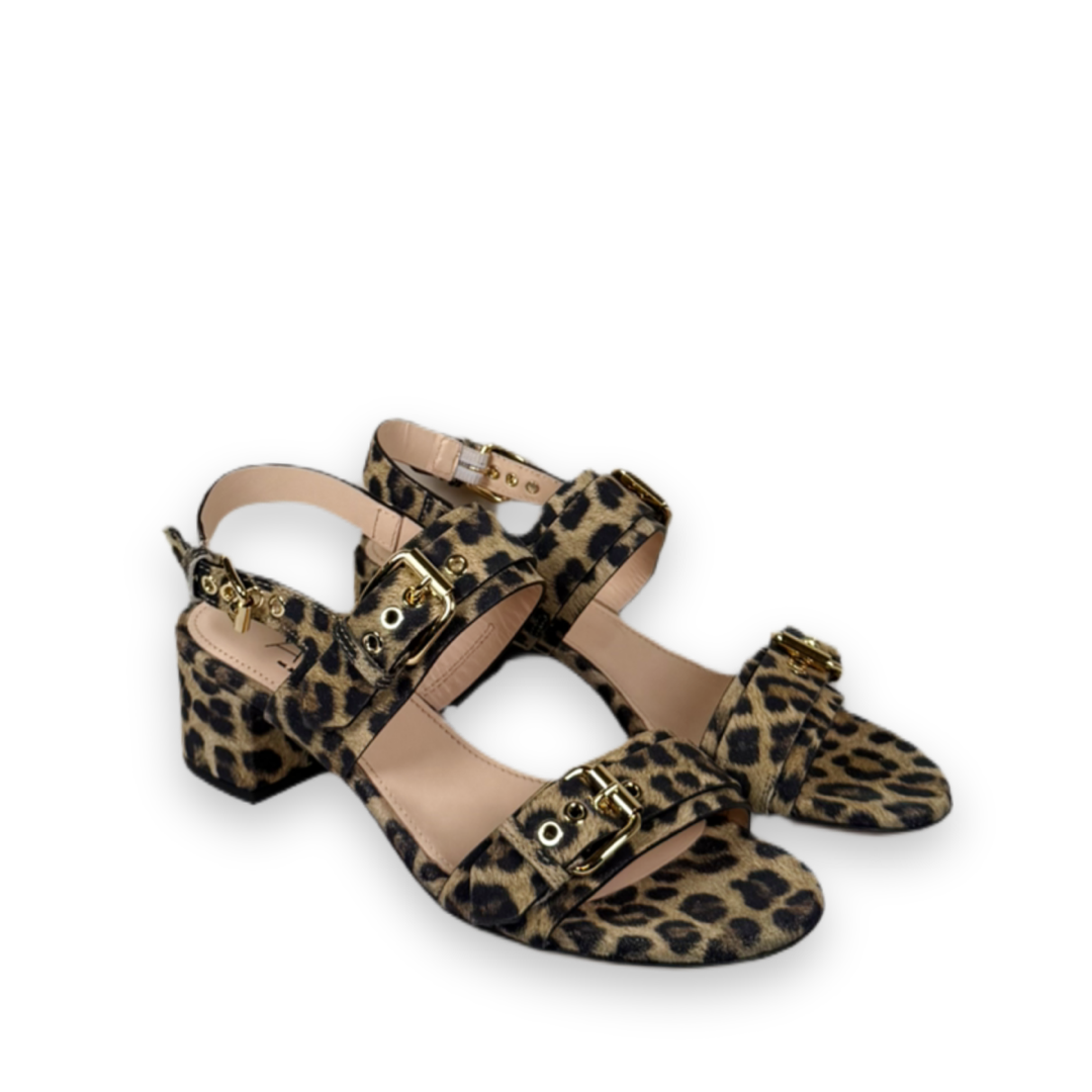 Deze luxe zomersandaal is uitgevoerd in fijn suède met een tijgerprint. Het model heeft twee banden over de voet lopen die afgesloten worden met een gouden verstelbare gesp. Om de hak loopt ook een hand die verstelbaar is. Het model heeft een bekleed blokhakje.
