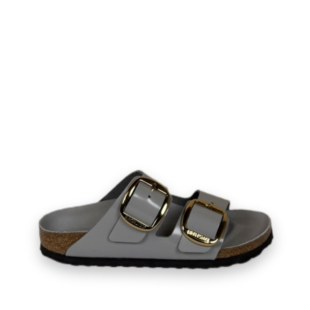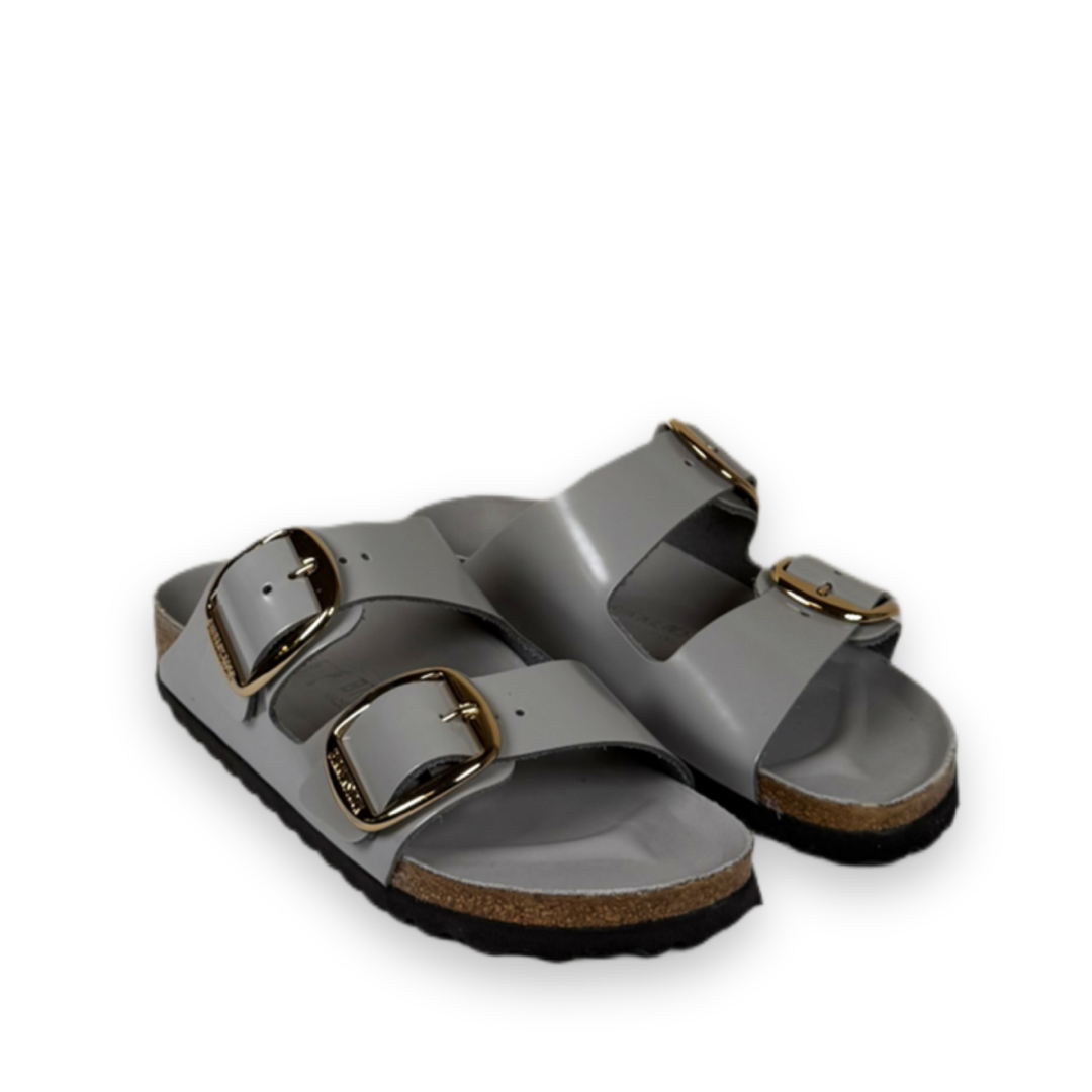Deze grijs leren slippers hebben dubbele banden afgewerkt met een opvallende gouden gesp. Het voetbed is zoals je van Birkenstock gewend bent. Deze slipper heeft de smalle/narrow pasvorm.