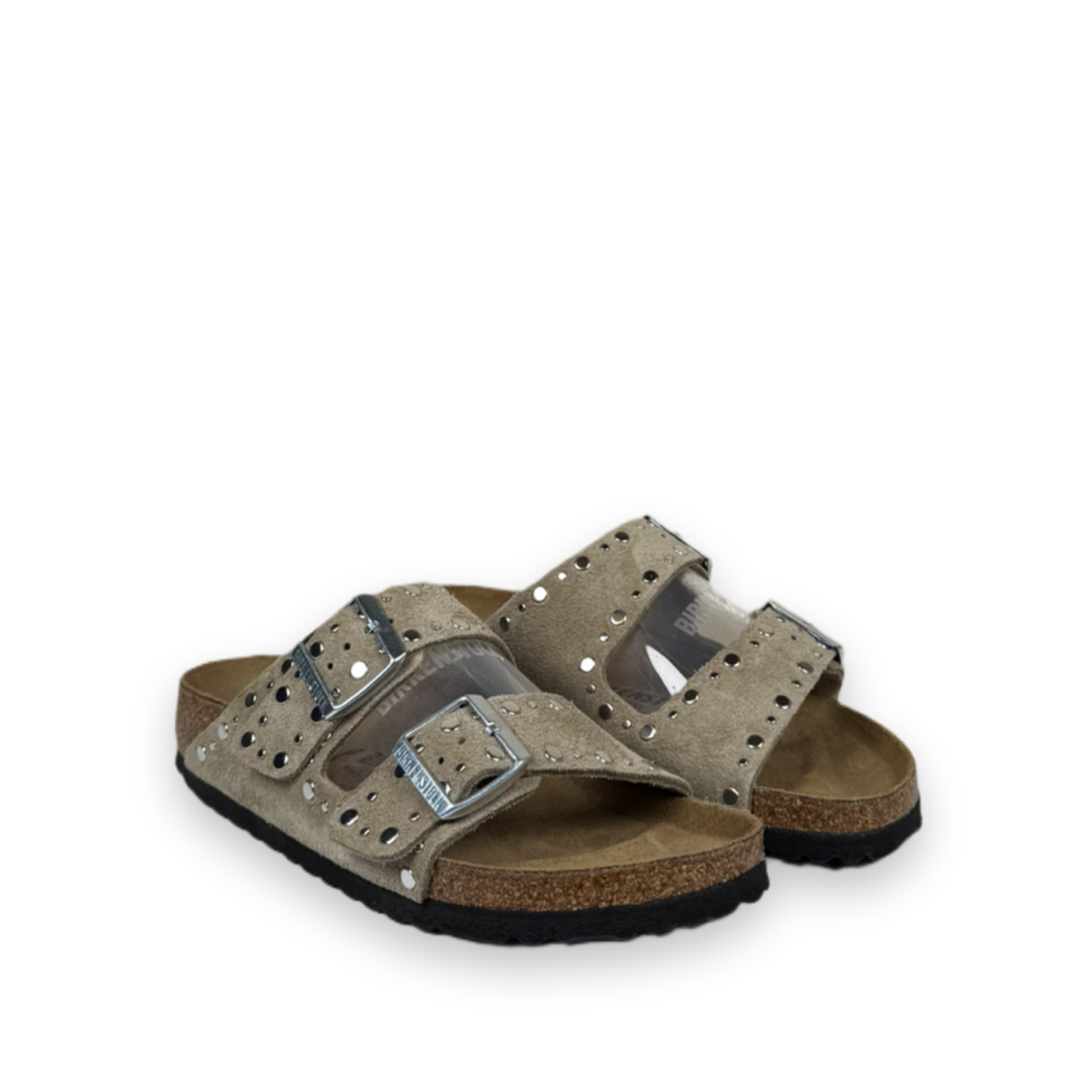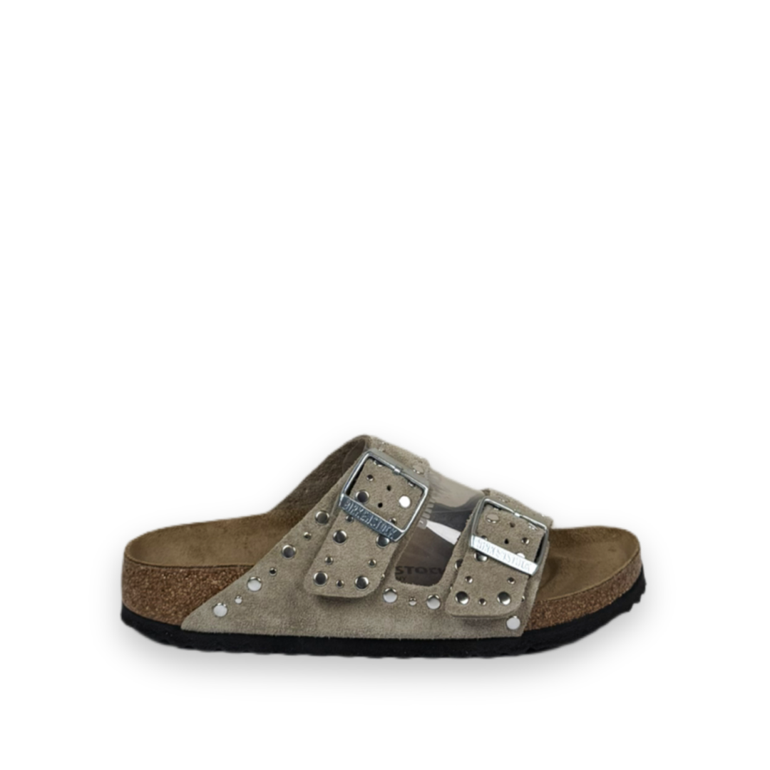Slipper model Arizona Rivet in de kleur taupe van Birkenstock.