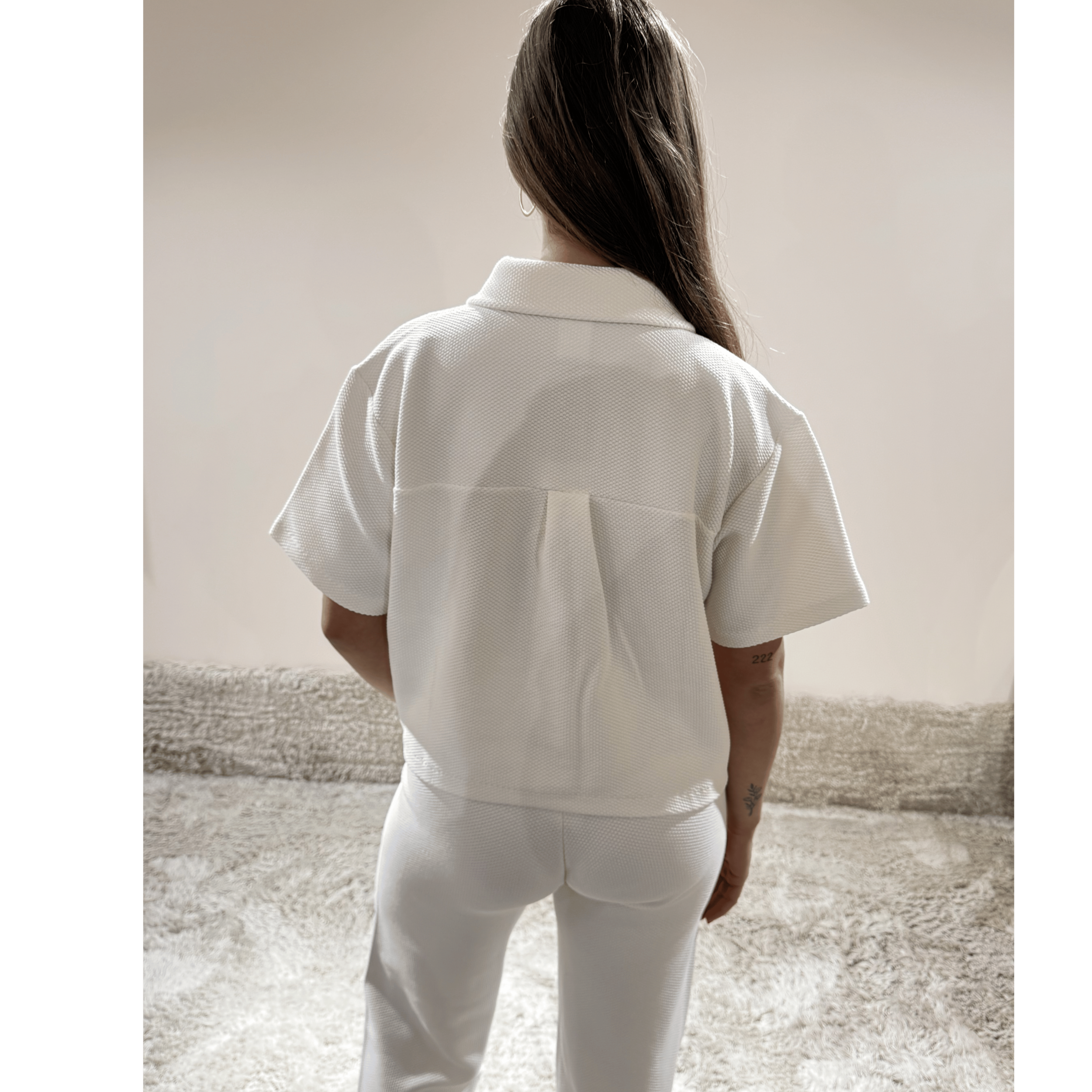 Deze blouse, uitgevoerd in een off white kleur, is gemaakt van 70% katoen. Hij heeft korte mouwtjes en sluit met knoopsluiting. Op de voorkant zitten twee grote zakken. De blouse valt tot aan de heup en de mouwen vallen wijd. Opvallend is het geribbelde patroontje wat de blouse heeft. Draag hem dicht als blouse of open als binnenjas.