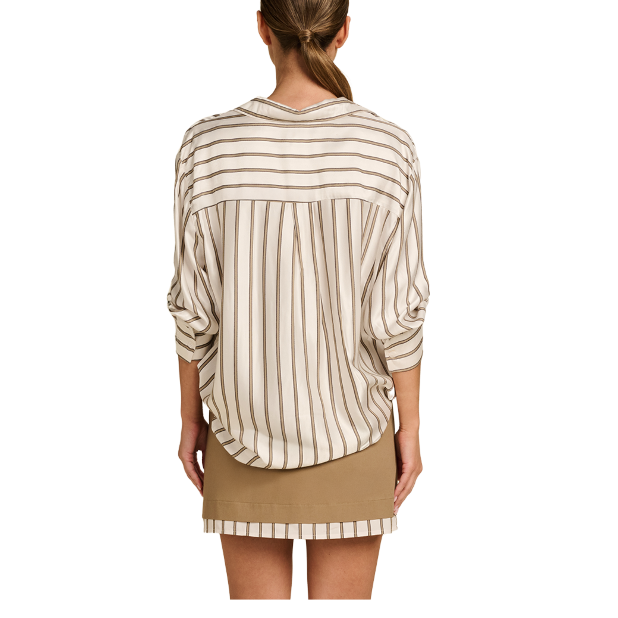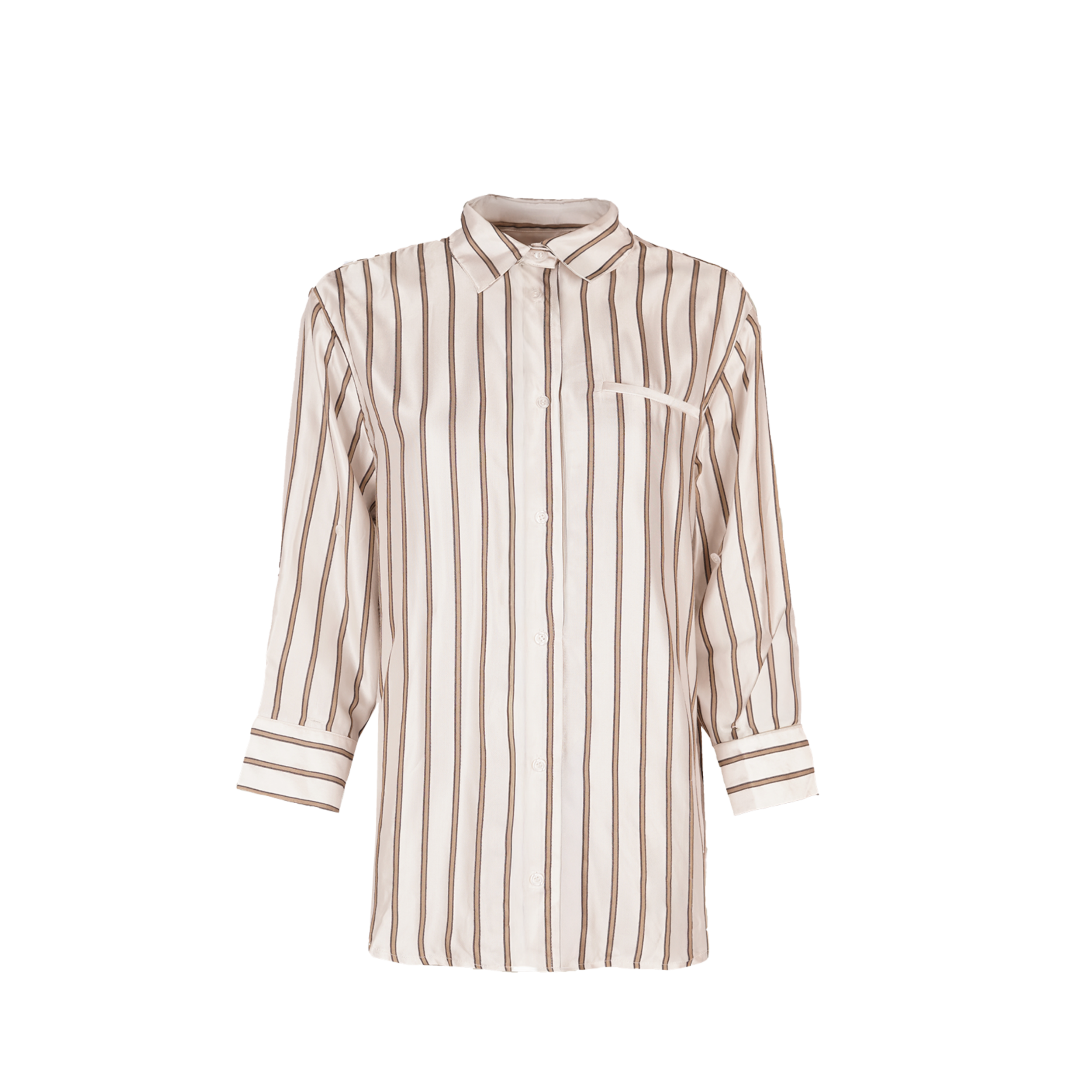 Deze blouse, uitgevoerd in 61% viscose en 39% rayon, heeft een off-white kleur. De blouse is afgemaakt met verschillende tinten bruine, verticale strepen. Op de borst zit nog een klein detail.