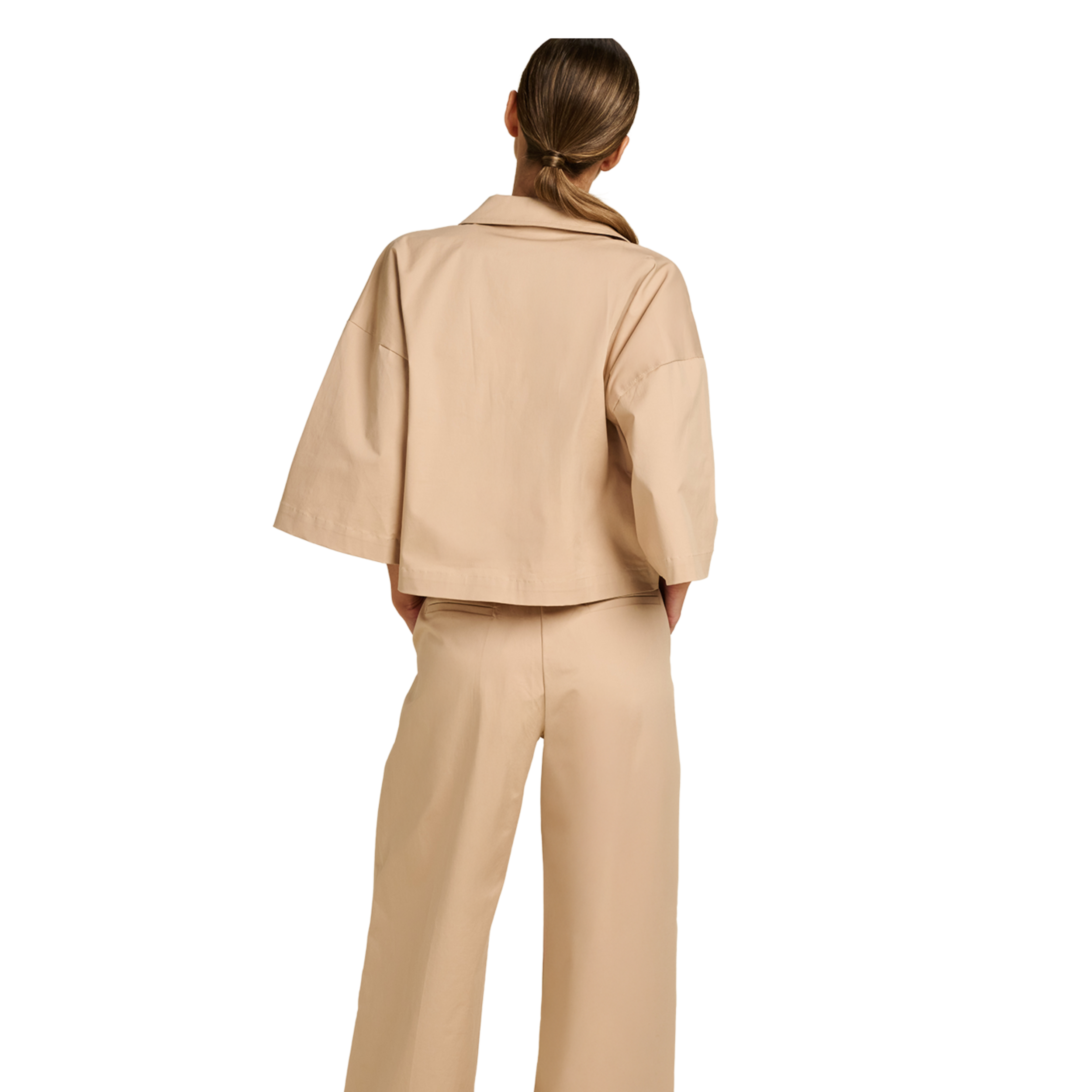 Deze korte blouse valt op door haar wijde mouwen en grote zakken op de voorkant. Hij is gemaakt van katoen en lyocell. De blouse heeft een v-hals met kraag en koopdetails. De mouwen vallen tot na de elleboog.