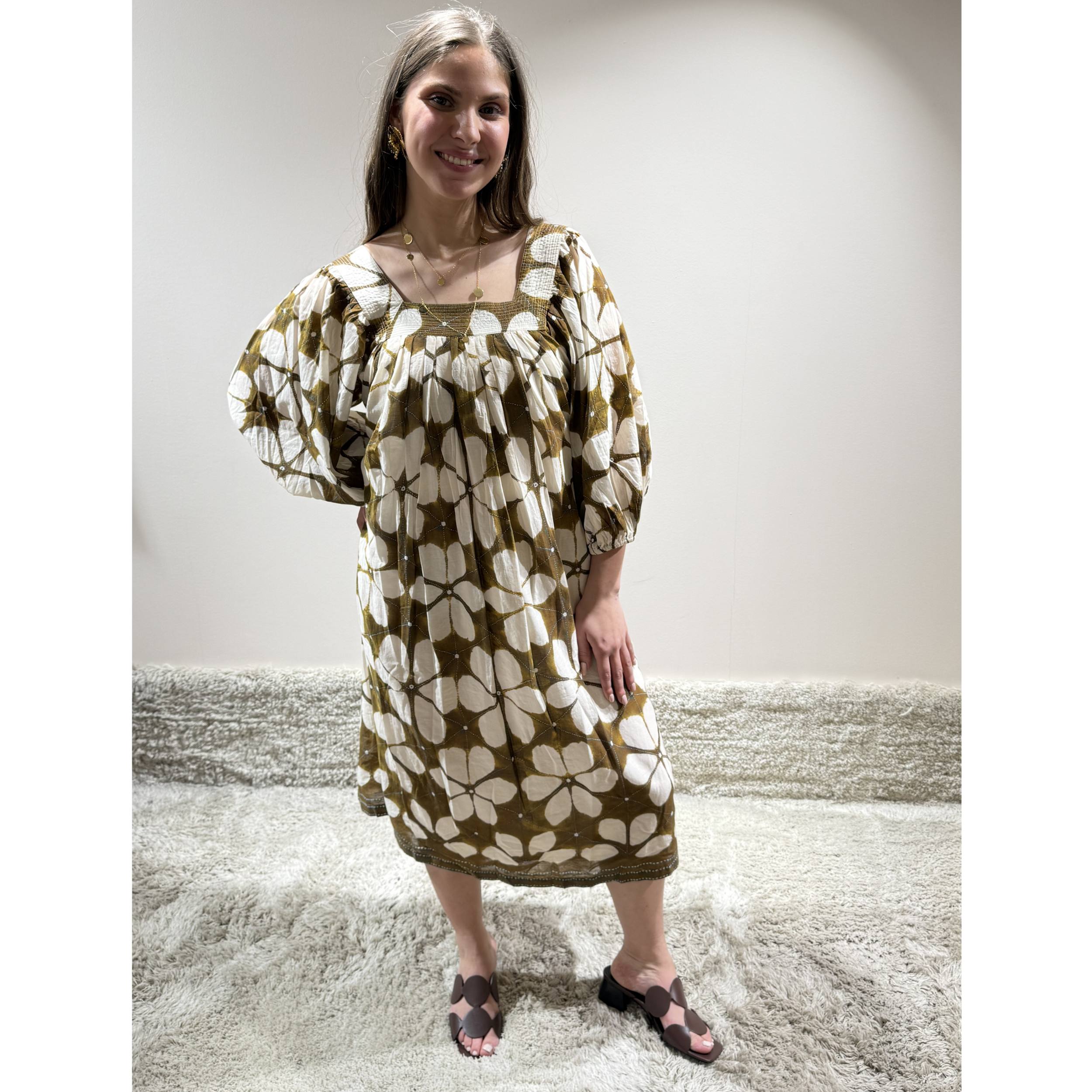 Luchtige jurk, gemaakt van 100% katoen. De jurk valt wijd en heeft ook wijde mouwen die vallen tot aan de elleboog. Opvallend aan de jurk is de vierkante hals met geribbelde boording, ook op de rug zit deze kraag zo. Over de gehele jurk loopt een witte bloemenprint, wat hem een zomerse look geeft. Bij de jurk zit een band waarmee je hem nog kan tailleren.