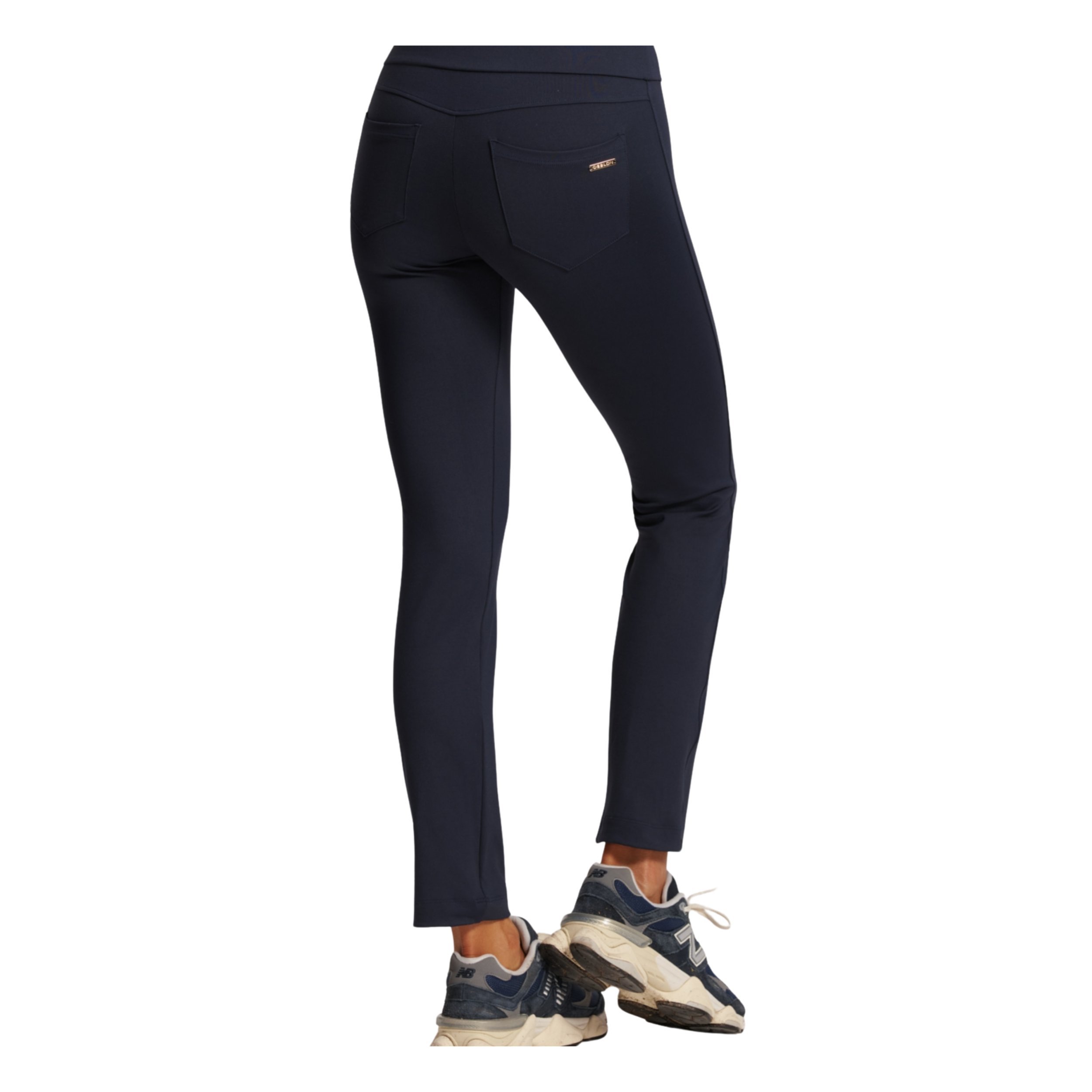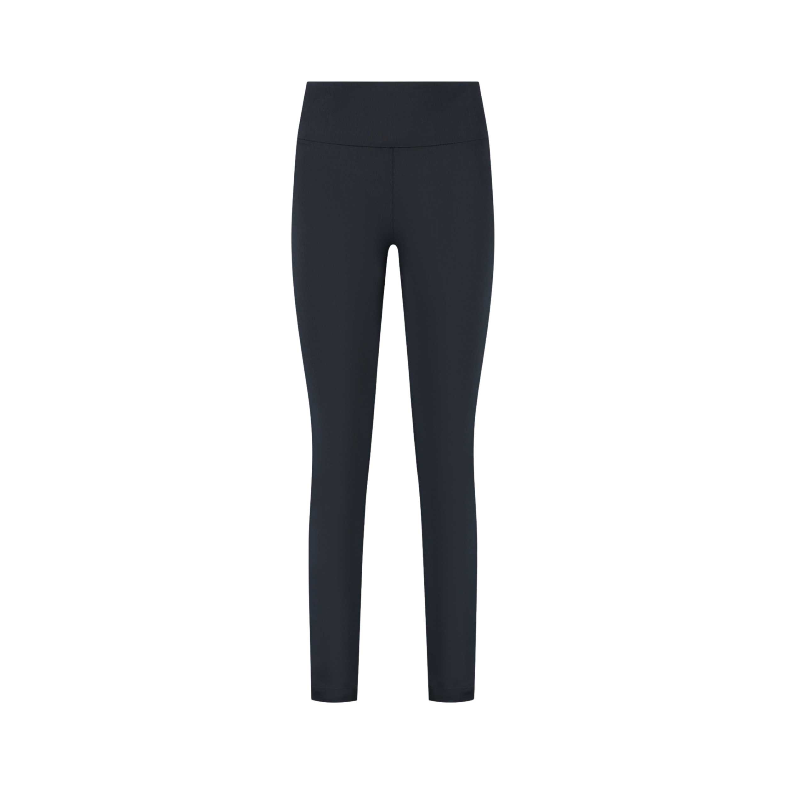 Deze legging, gemaakt van een comfortabele stof, is uitgevoerd in een donkerblauwe kleur. Opvallend aan de legging is de cropped look, met lengte tot net boven de enkels en een rechte pijp. De legging heeft een hoge tailleband.