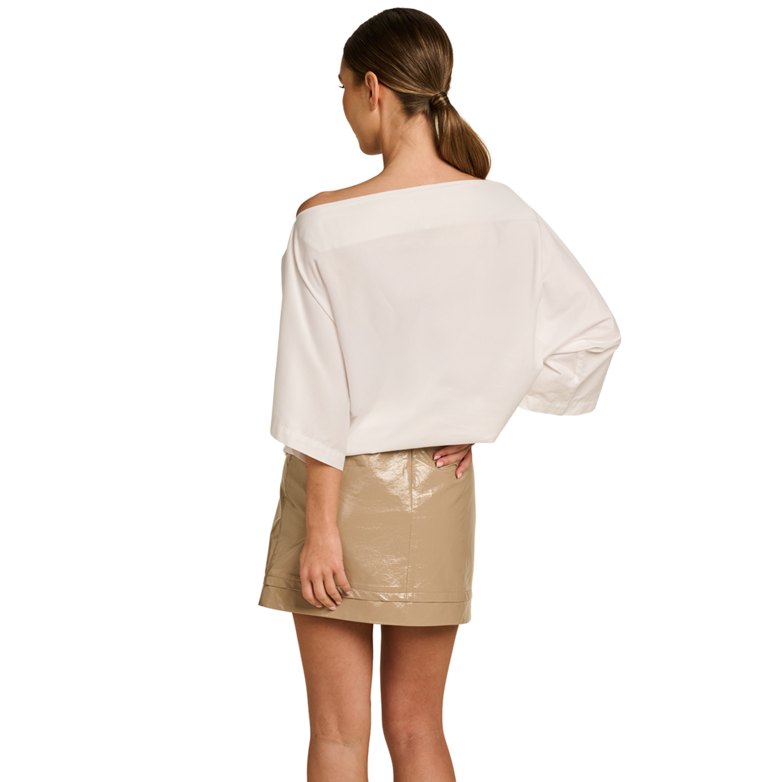 Beige rok gemaakt van een mix van polyurethaan en polyester. Deze korte rok is door haar neutrale, beige kleur tijdloos en ideaal te combineren.
