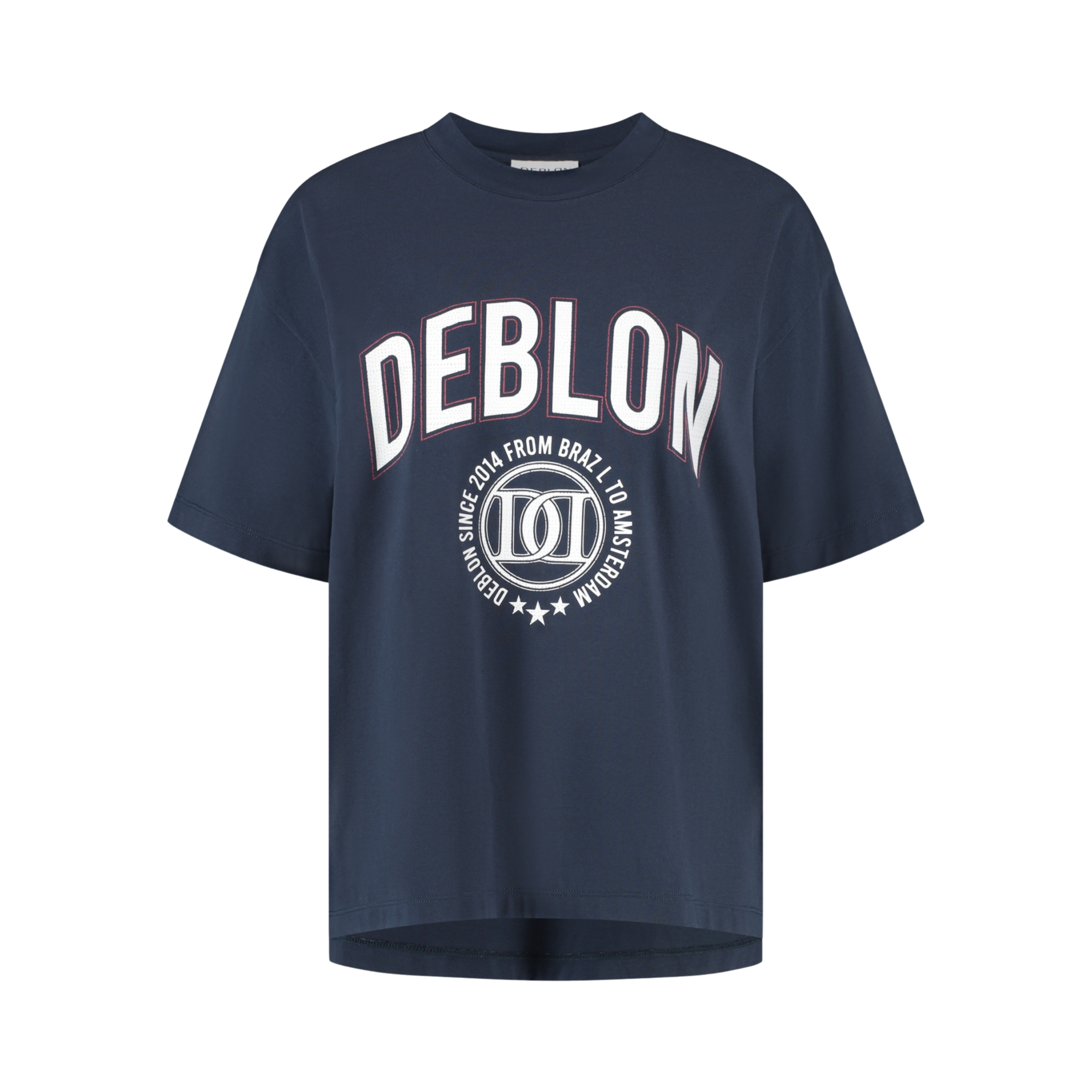 T-shirt in het donkerblauw met een witte opdruk erop. De opdruk, bestaande uit het Deblon logo heeft een bordeaux kleur omlijning.