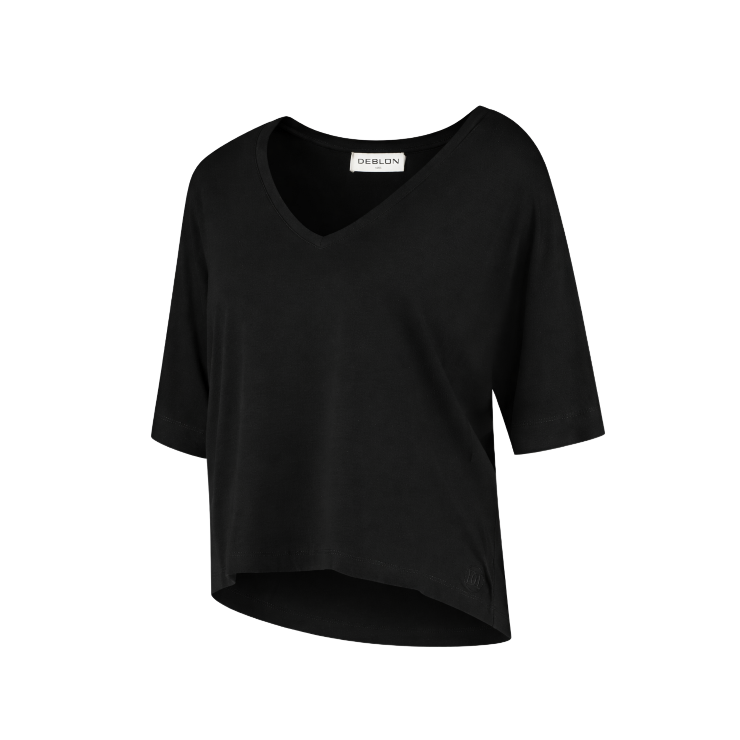 Basic zwart shirt uitgevoerd in 94% viscose en 6% elasthane met een v-hals. Valt ruimer en achter is hij langer dan voor. Mouwen vallen tot de elleboog.