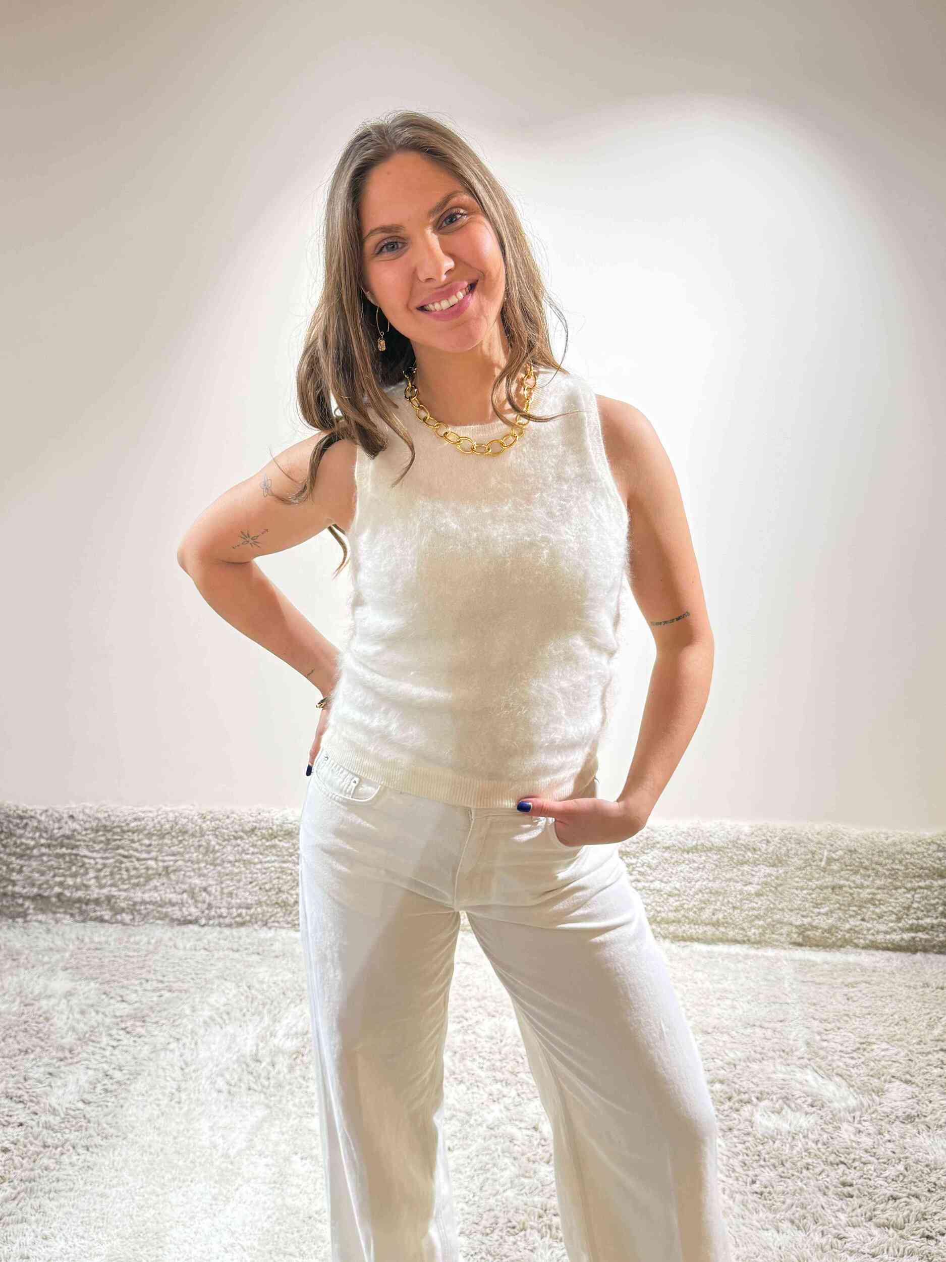 Deze mouwloze top heeft een hele licht witte kleur. Hij is gemaakt van 100% cashmere en heeft een ronde hals.