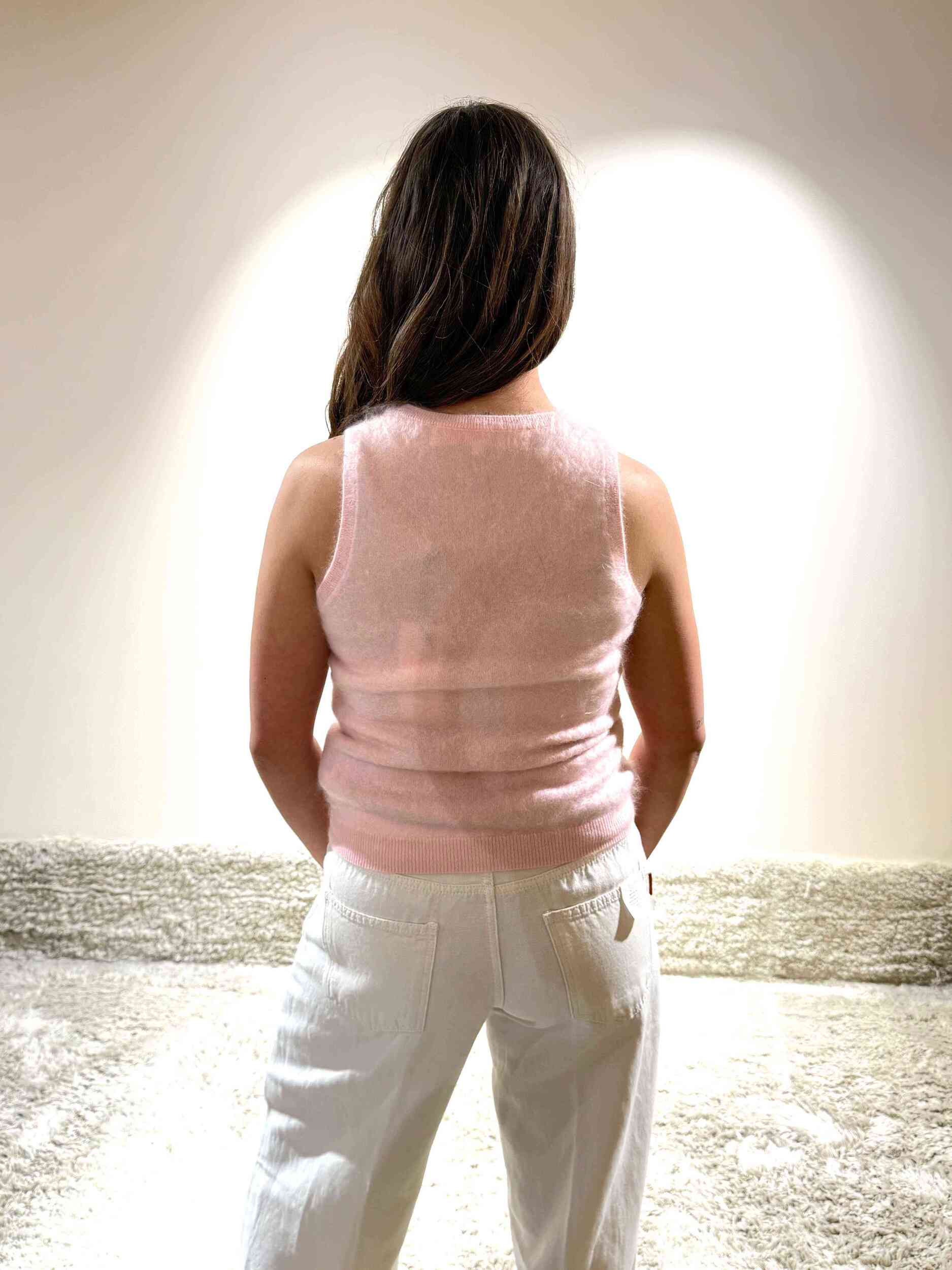 Deze mouwloze top heeft een hele lichtroze kleur. Hij is gemaakt van 100% cashmere en heeft een ronde hals.