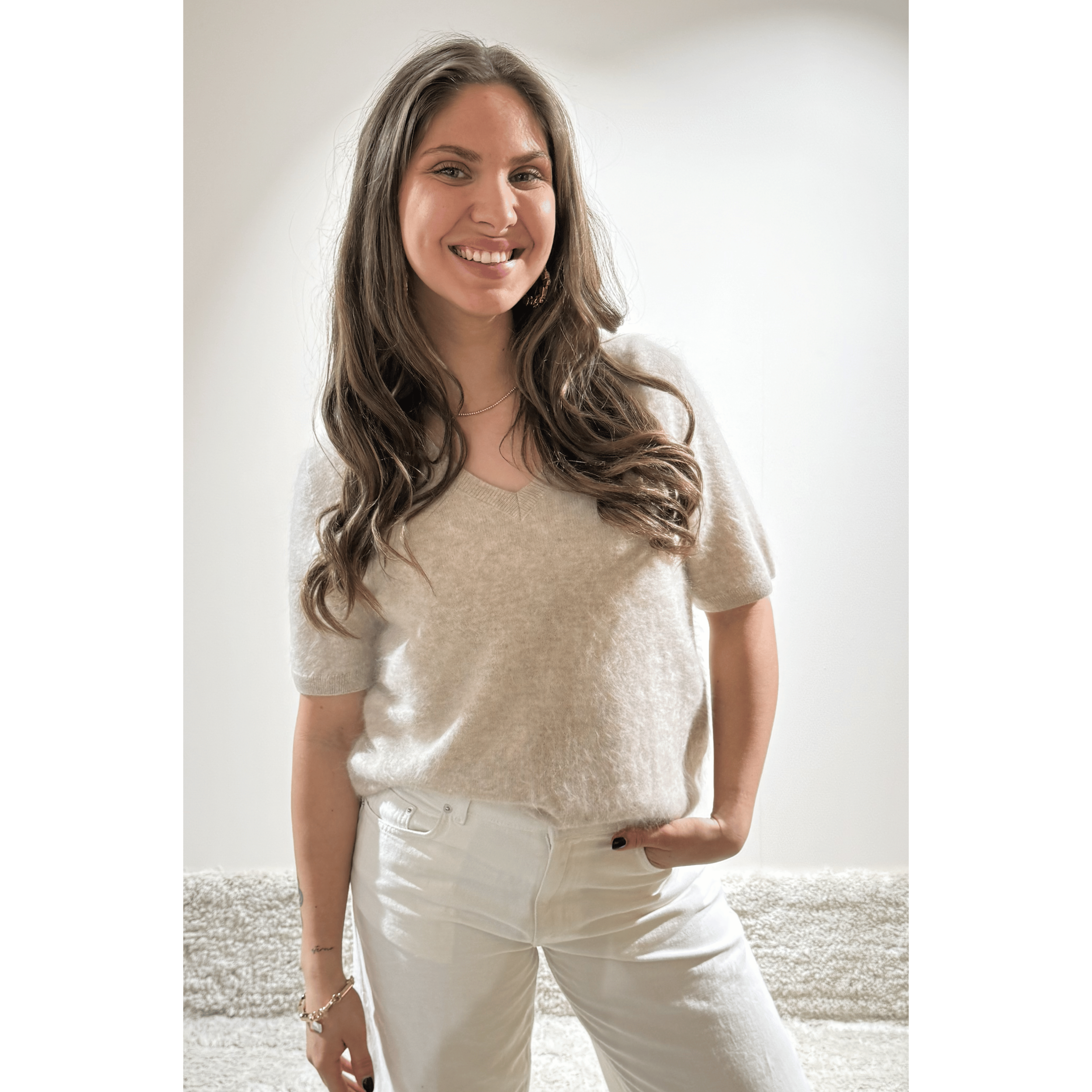 Dit shirt, gemaakt van 100% cashmere, is uitgevoerd in een beige kleur. Perfect voor het voorjaar. Het shirt heeft een v-hals met boording rondom de mouwen, hals en taille.