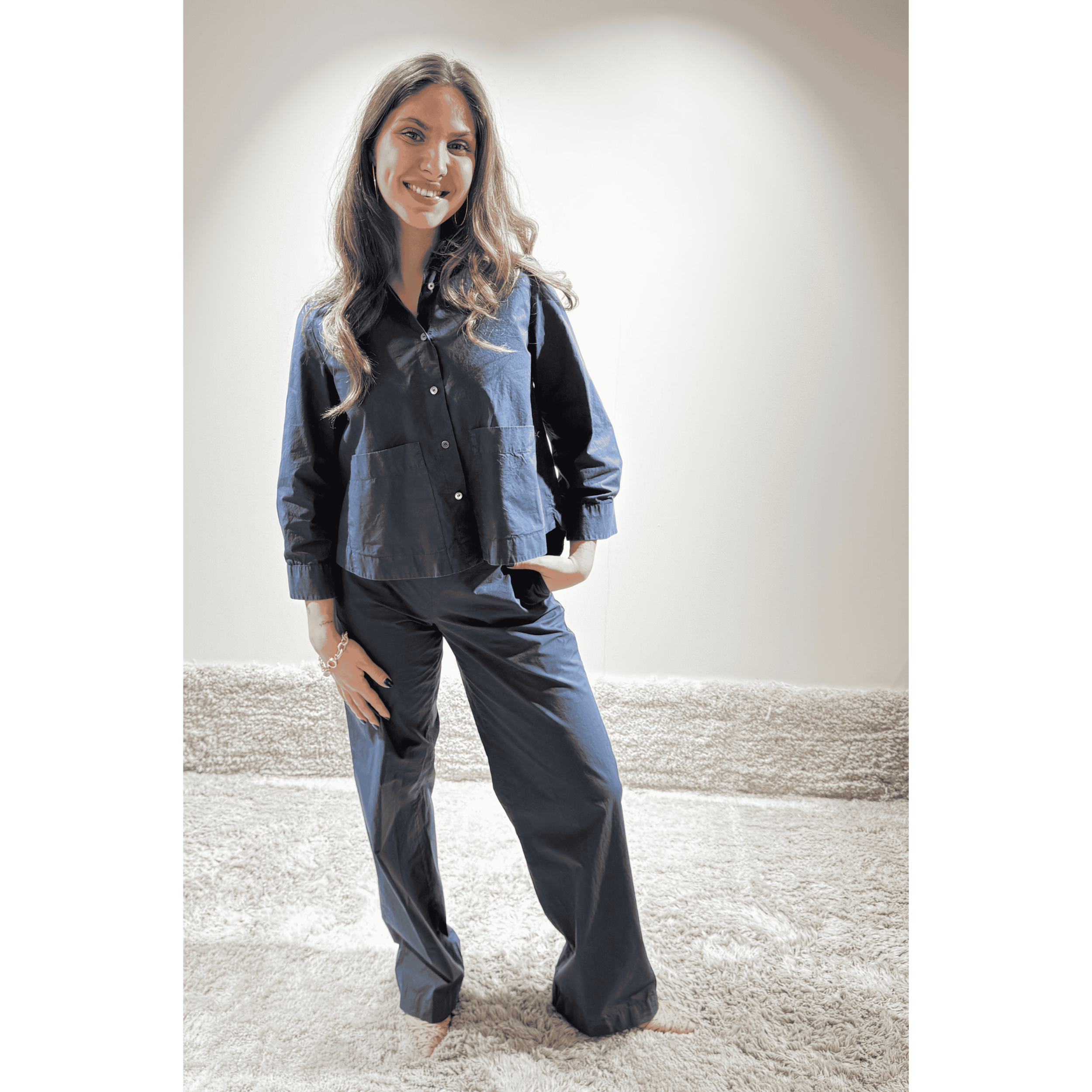 Deze broek van 100% katoenen stof valt tot over de enkel en heeft een elastieke band aan de achterkant. Voor heeft de broek 2 zakken. Hij is uitgevoerd in een donkerblauwe kleur en perfect te combineren met de Molly blouse van Andiata.