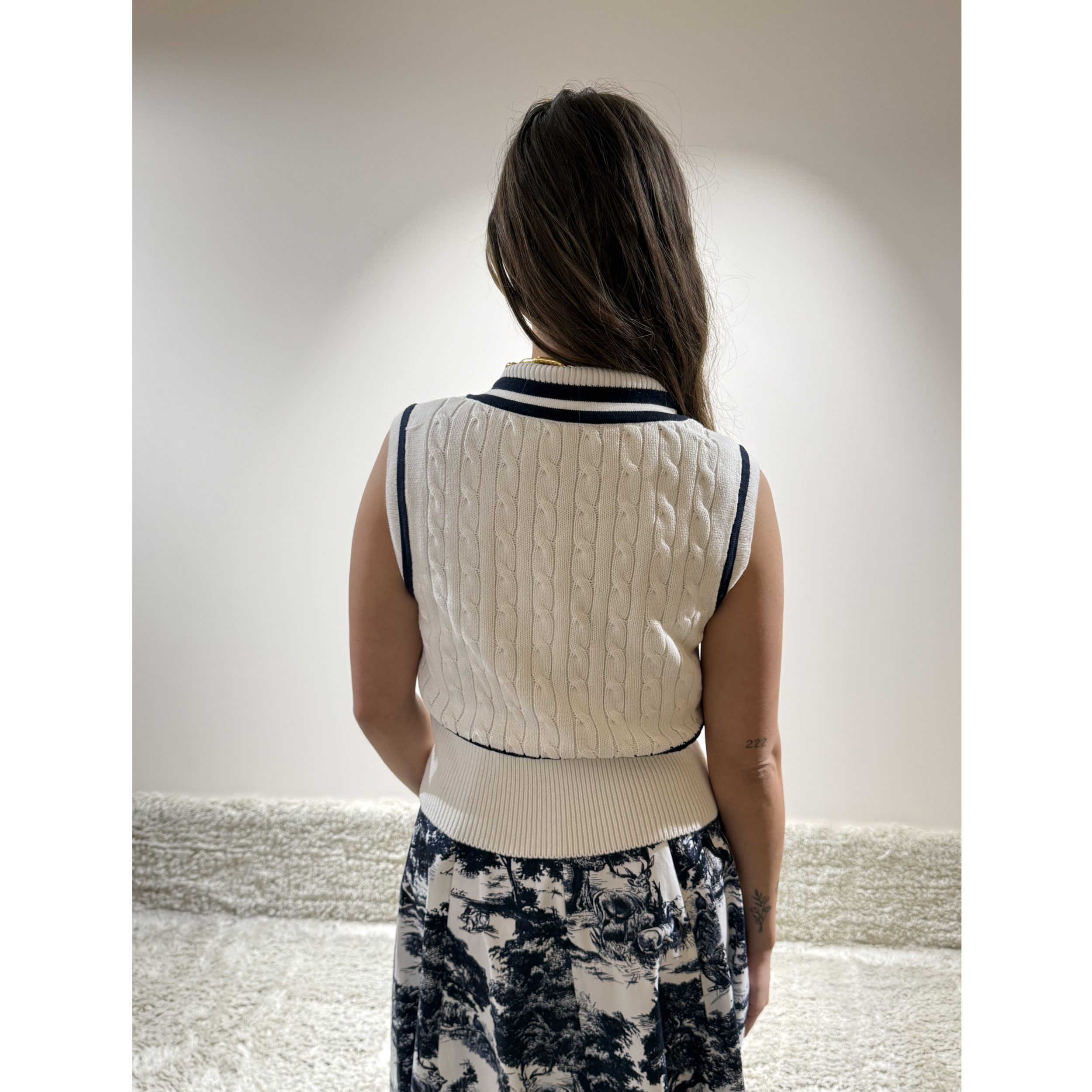 Deze spencer, gemaakt van 100% katoen, is uitgevoerd in een witte kleur met blauwe details. De spencer is mouwloos, heeft een v-hals en een getailleerd model. Aan de onderkant zit een geribbelde zoom. Verder heeft de spencer op het midden een gevlochten effect.
