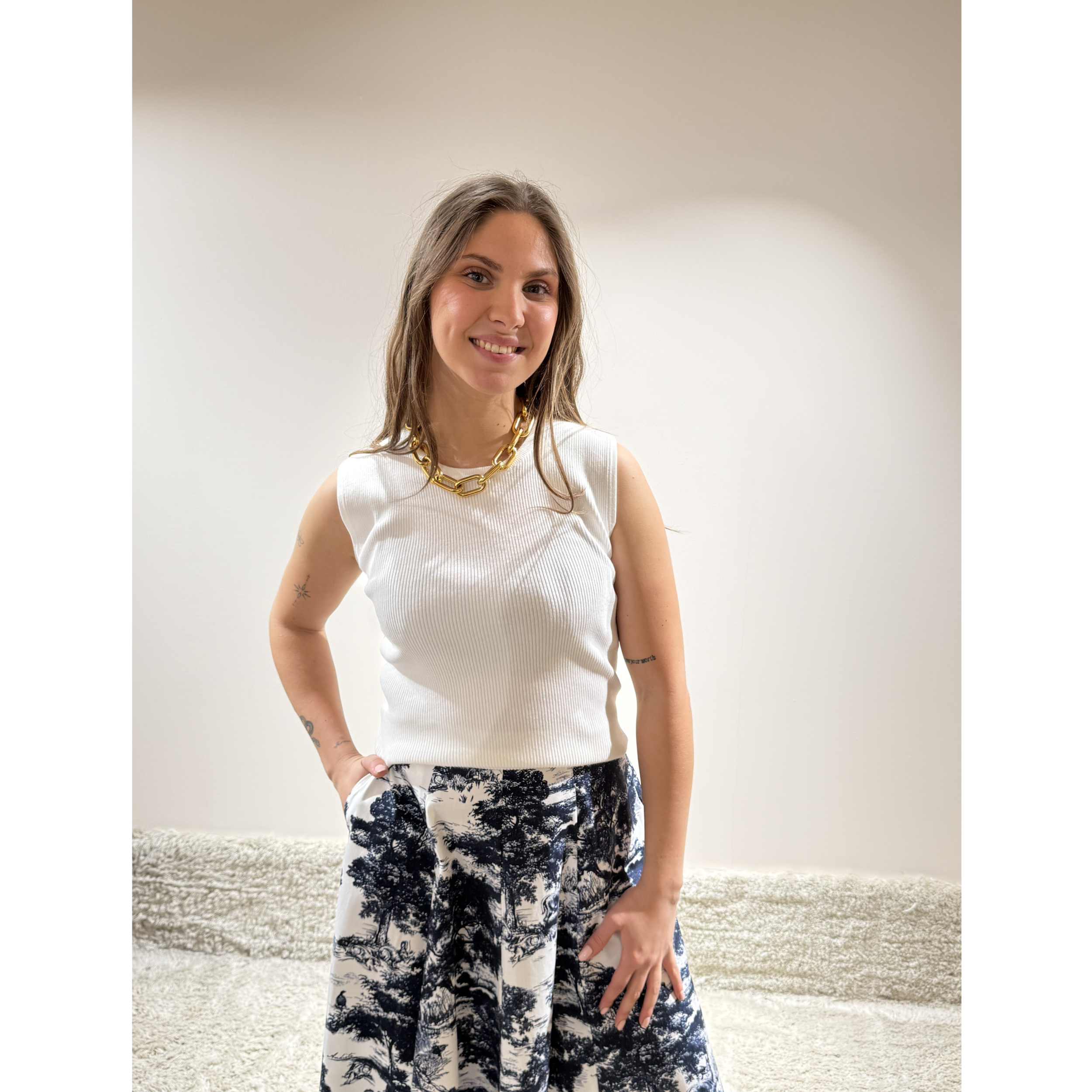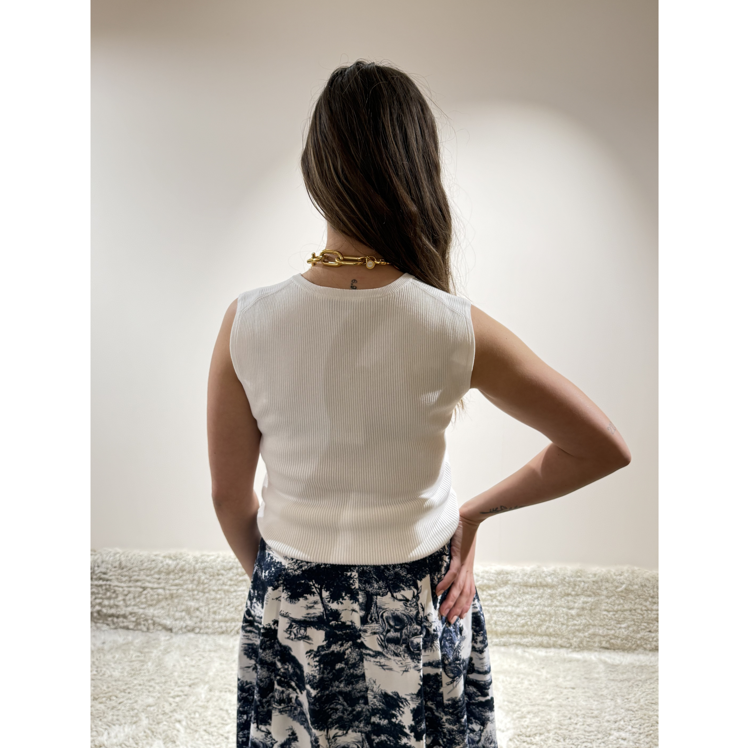 Deze mouwloze top is gemaakt van 78% Viscose, 22% Polyamide en uitgevoerd in een witte kleur. De top heeft een ronde hals en een geribbelde print. Hij valt tot over de heup.