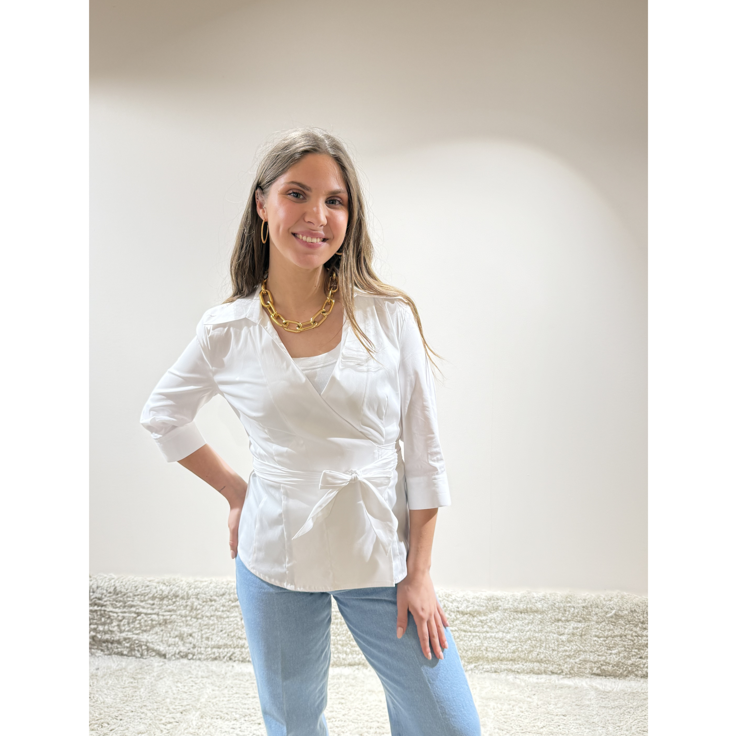 Deze blouse, gemaakt van een combinatie van katoen, polyamide en elastine, is uitgevoerd in een witte kleur. Hij heeft een v-hals en strakke mouwtjes tot net aan over de elleboog. Opvallend aan de blouse is de strik rondom de taille, wat de blouse een strakke fitting geeft. Verder lopen er verschillende naden over de blouse ter detail.