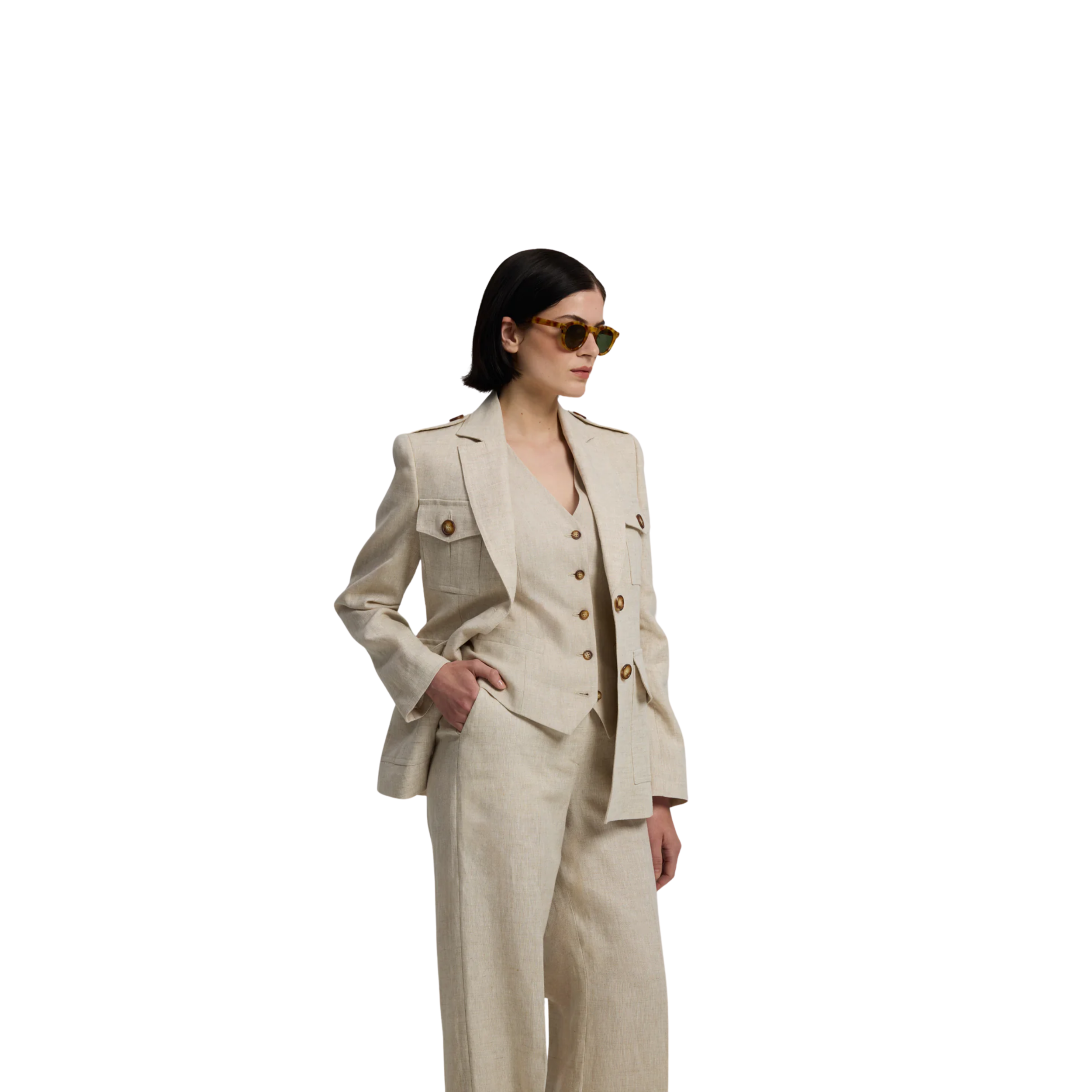 Deze gilet top is gemaakt van hoge kwaliteit linnen. Hij heeft een beige kleur en diepe v-hals. Ook aan de onderkant is er een ‘v’ cut. Opvallend aan de gilet is de achterkant, waar een strik zit om de top de tailleren. Combineer hem met de Kris blazer en Gisella pantalon voor de volledige outfit.