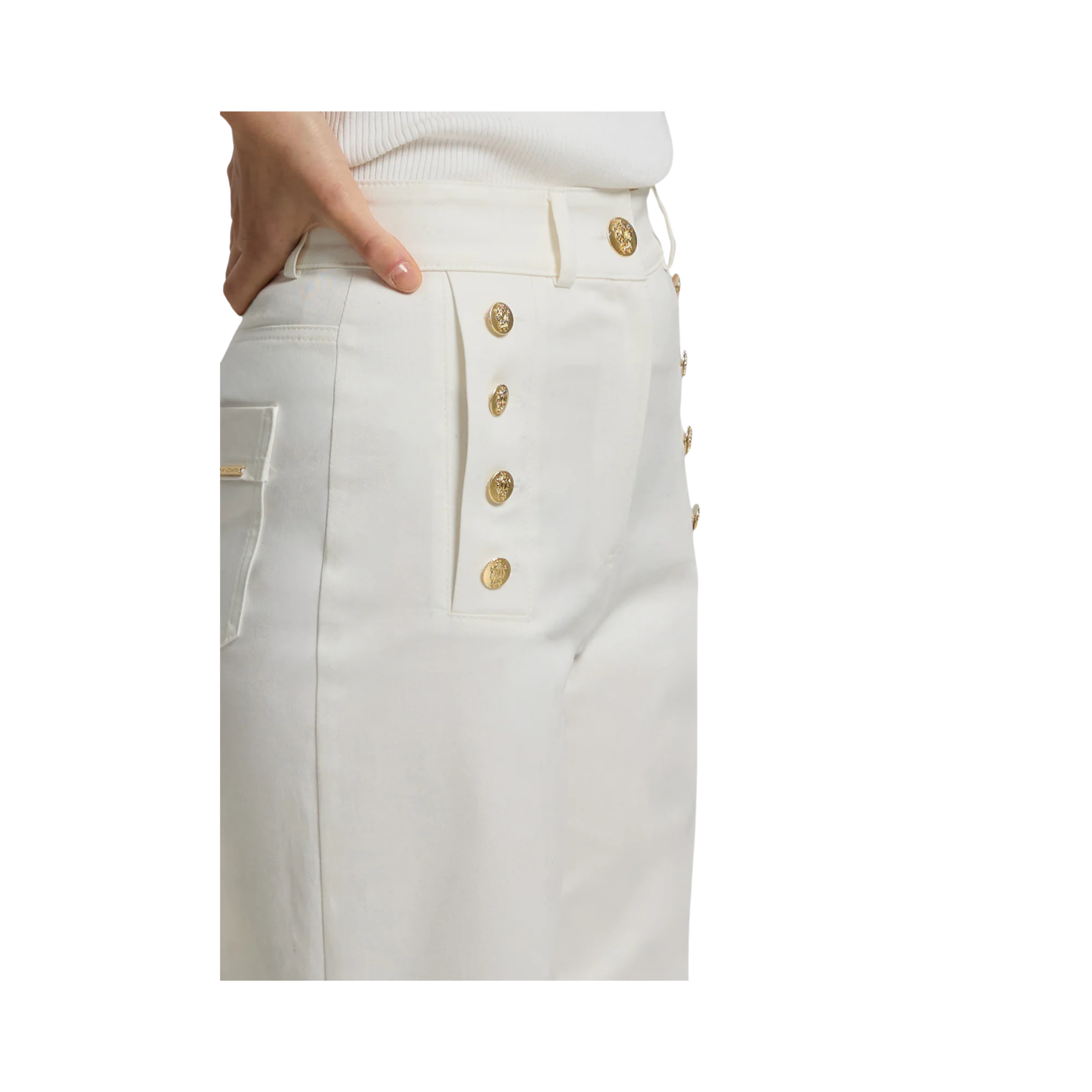 Broek gemaakt van katoen en uitgevoerd in een witte kleur. De broek valt tot aan de enkels, valt strakker bij de taille en heupen en loopt wijd uit. De broek heeft voorzakken die afgewerkt zijn met gouden knopen.