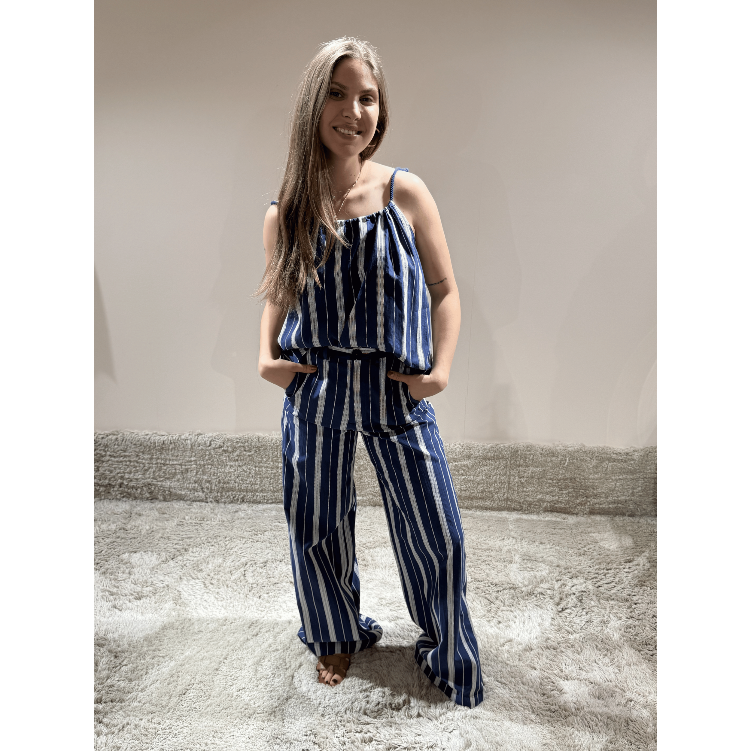 Deze broek, gemaakt van 100% katoen, is ideaal voor de warme dagen! Hij is uitgevoerd in een donkerblauwe kleur en heeft witte strepen. De broek heeft twee voorzakken en sluit met knoopsluiting en rits. Combineer hem met de Magda top voor een complete look!