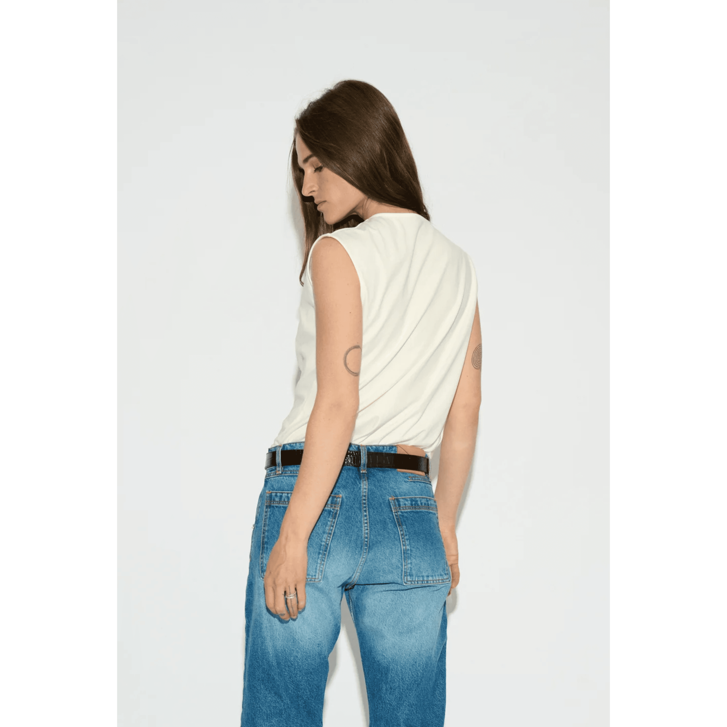 Witte top, gemaakt van katoen met korte mouwtjes. Hij heeft een ronde hals met gedrapeerde details en asymmetrisch effect.