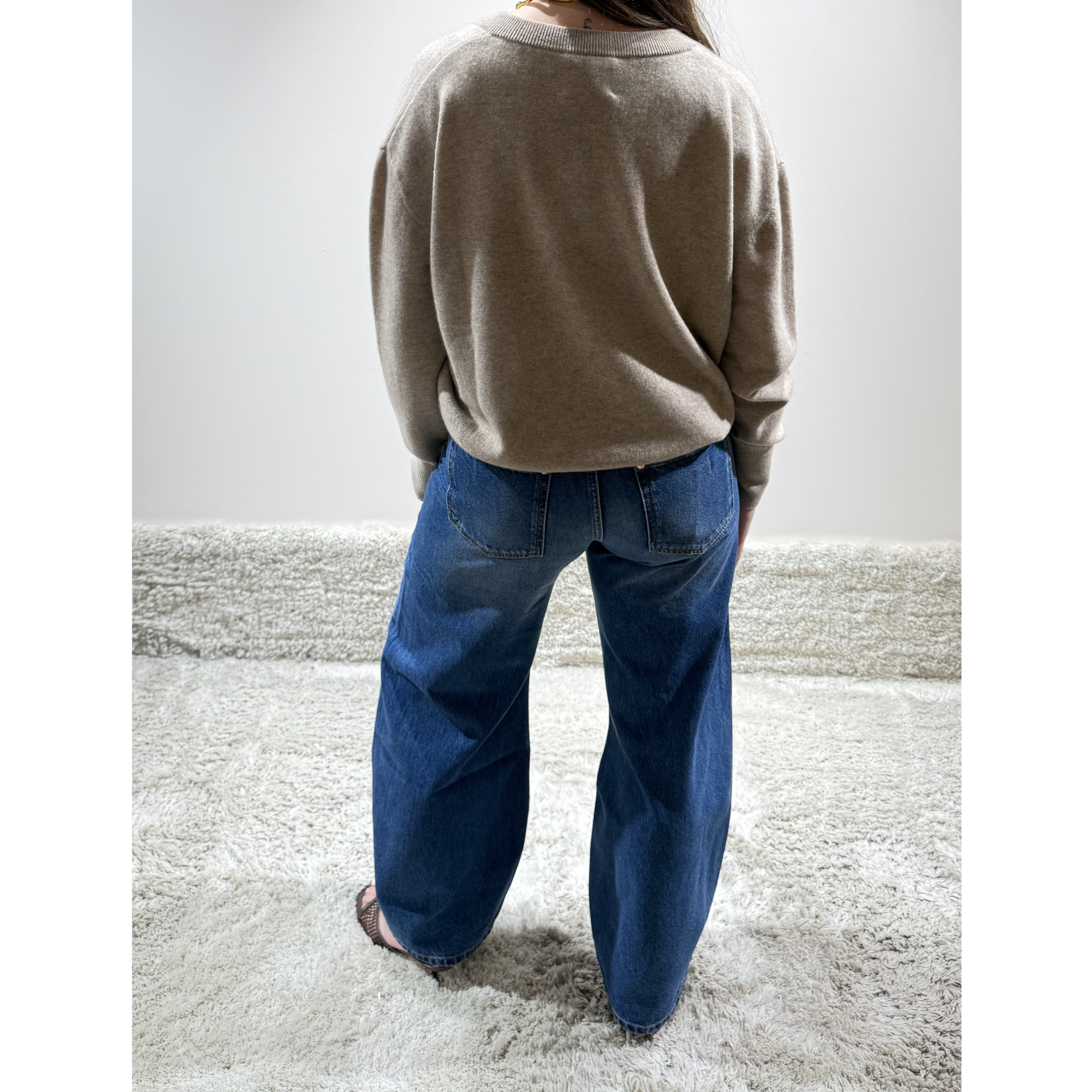 Deze spijkerbroek, gemaakt in een donkerblauwe kleur, valt op door de grote zakken aan de voorkant. Verder heeft de broek een balloon fit, hij valt wijd bij de benen en is een mid-raise model. Op de achterkant zitten ook nog twee zakken. De washing geeft nog een lichte kleur in het midden van de broekspijpen.