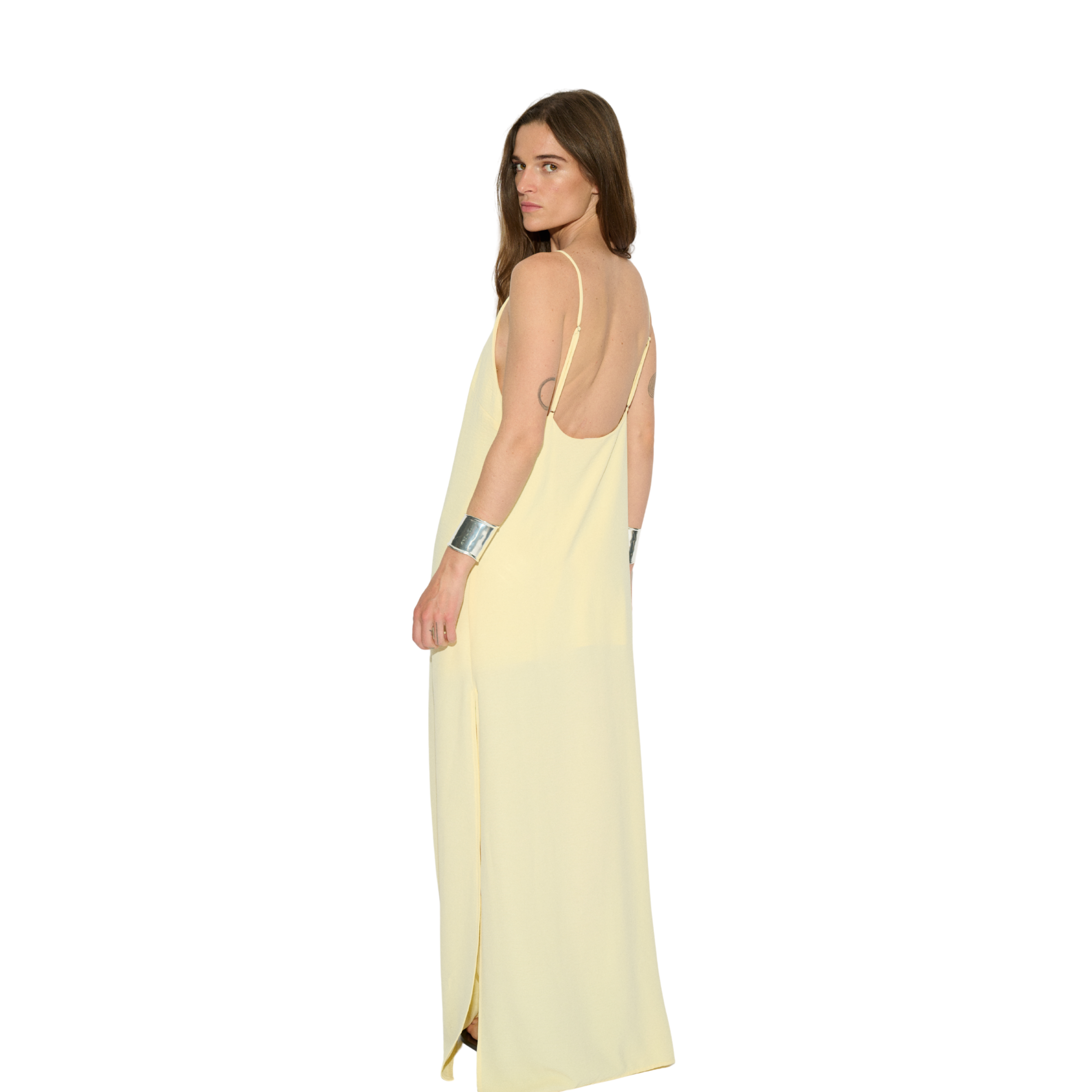 Deze jurk, gemaakt van 100% polyester is ideaal voor de zomerdagen. De jurk is lang en valt tot de voeten. Hij heeft spaghetti bandjes en een rechte hals. Aan beide zijkanten zit een split. De achterkant is redelijk laag uitgesneden.