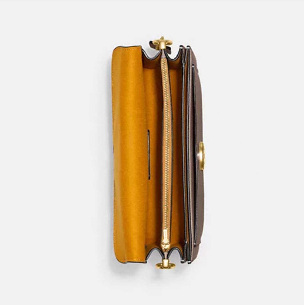 Deze luxe designertas is uitgevoerd in taupe gepolijst en getrommeld leer. De tas heeft twee verschillende straps die je kunt bevestigen en die met goud zijn afgewerkt. De korte strap gebruik je om de tas als schoudertas te dragen. De lange strap is verstelbaar en kan crossover gedragen worden. Binnen in de tas heb je een zijvakje met een rits en middenin heb je nog een afgesloten vak met een rits. De flap sluit af met een drukker en een magneet en het bekende logo vind je in het goud op de flap. Tabby is de meest iconische tas van het Amerikaanse merk Coach.
