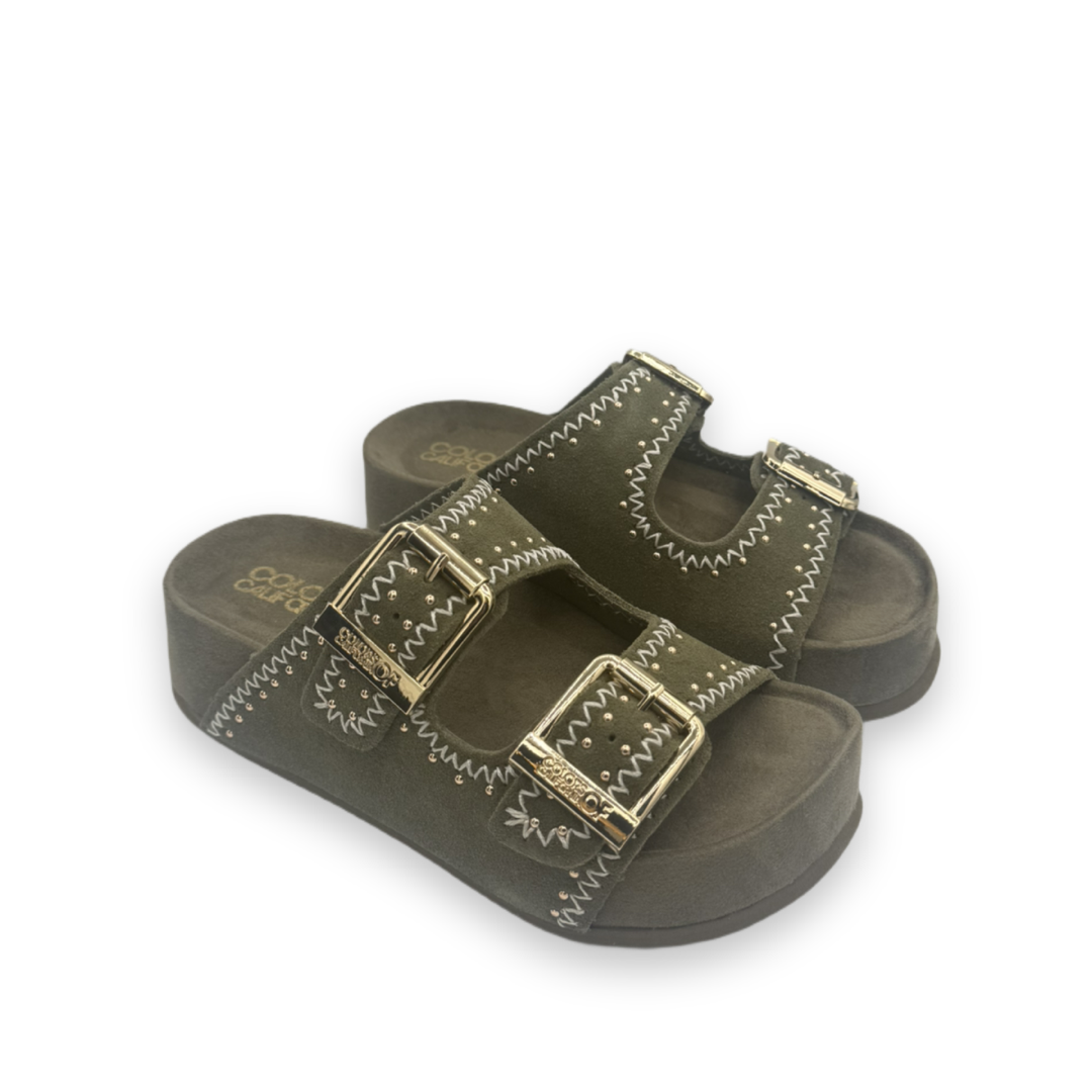 Deze slipper, gemaakt van een zachte suède, is uitgevoerd in een khaki groene kleur. De zool heeft een hoog platform en de slipper heeft twee verstelbare banden, afgewerkt met kleine gouden studs en gouden gespen. De schoen is afgemaakt met contrasterende stiksels in een zigzag patroon.