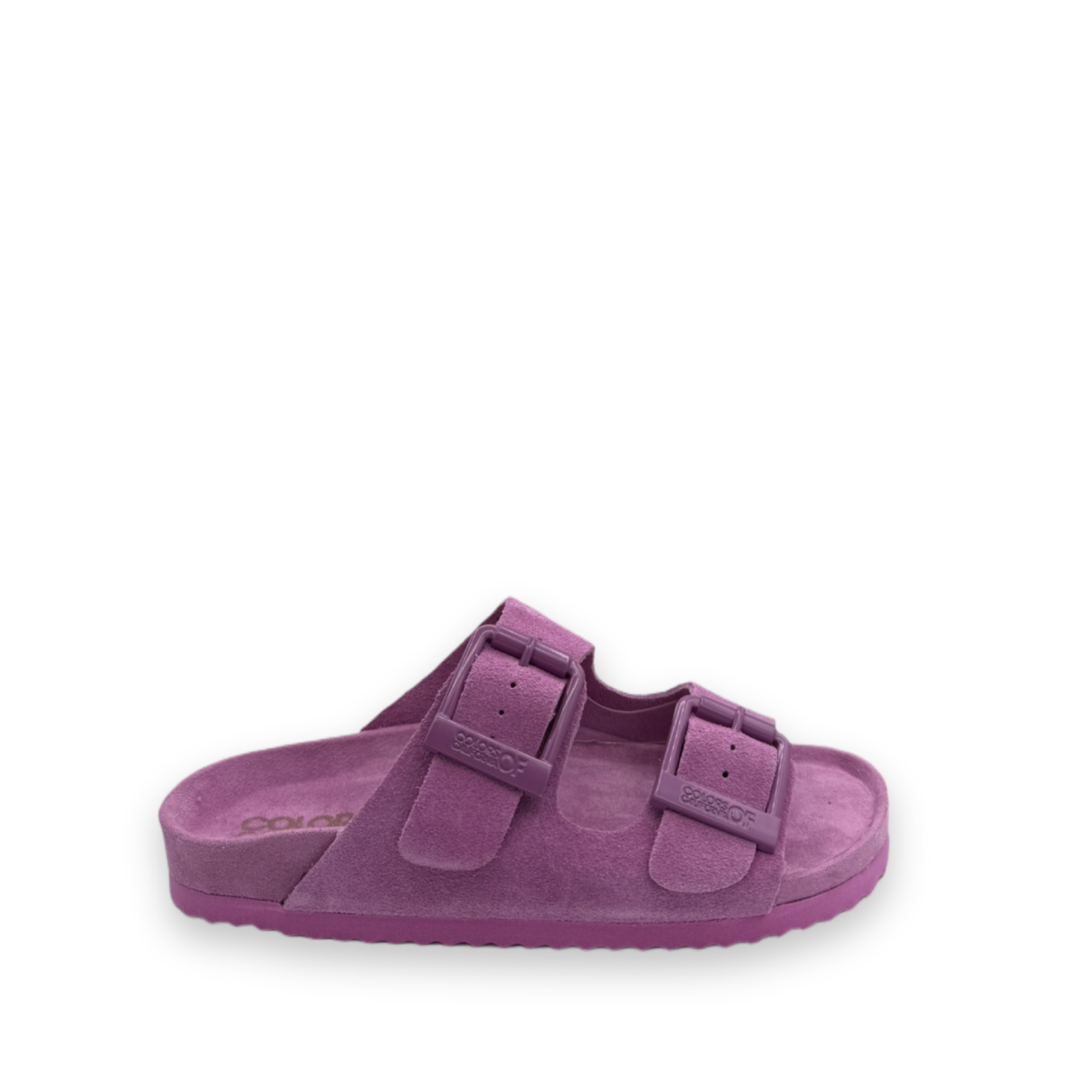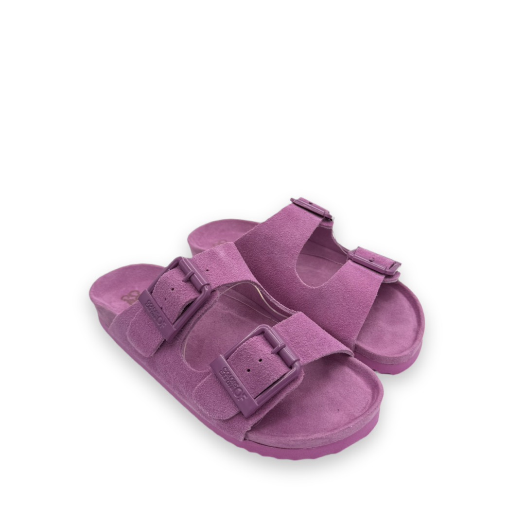 Deze slipper, gemaakt van een zachte suède stof, is ideaal voor de zomerdagen. Hij heeft een opvallende roze kleur en maakt je outfit helemaal af. De slipper heeft twee verstelbare banden en een metalen gesp in dezelfde roze kleur. Fijn aan de slipper is het zachte voetbed voor comfort.