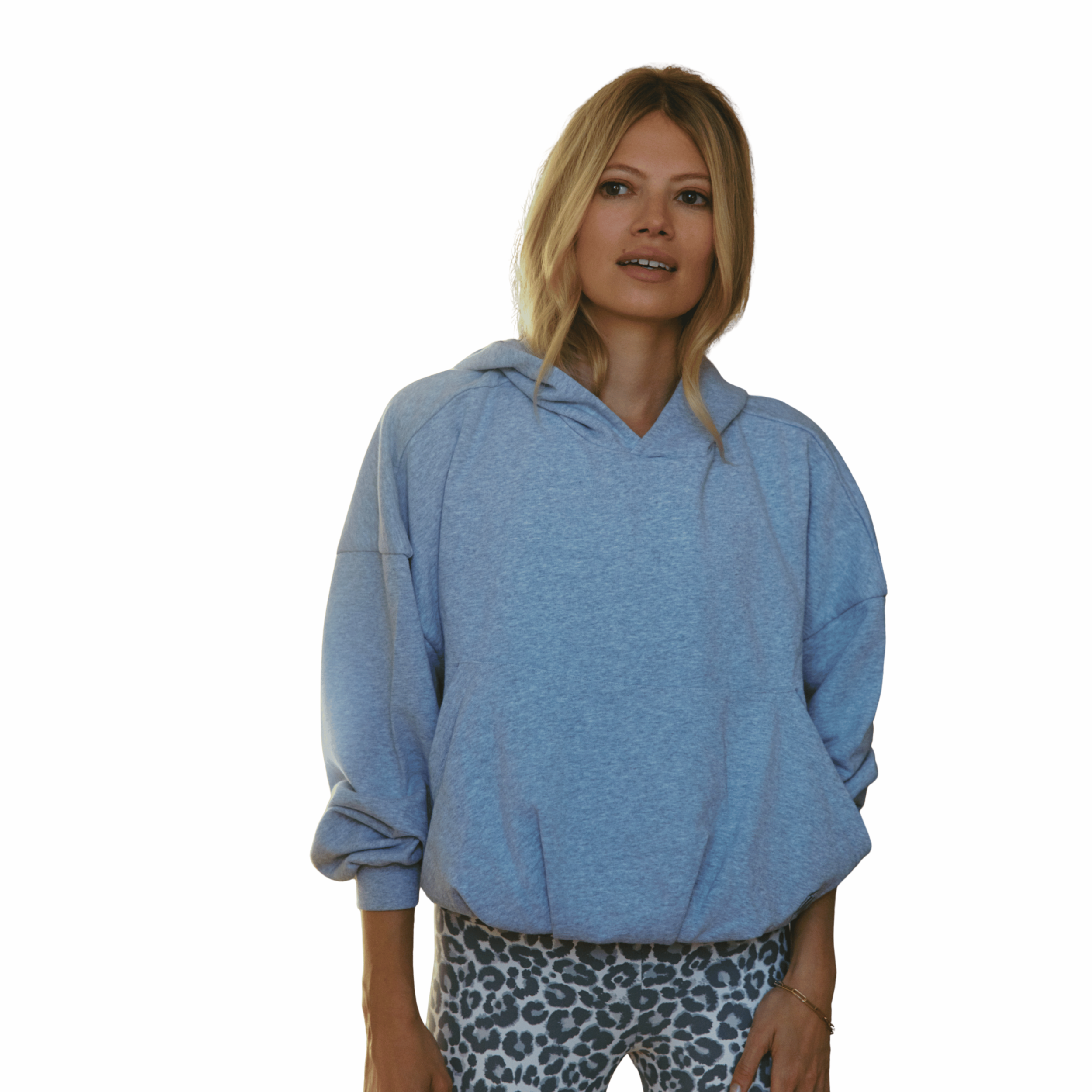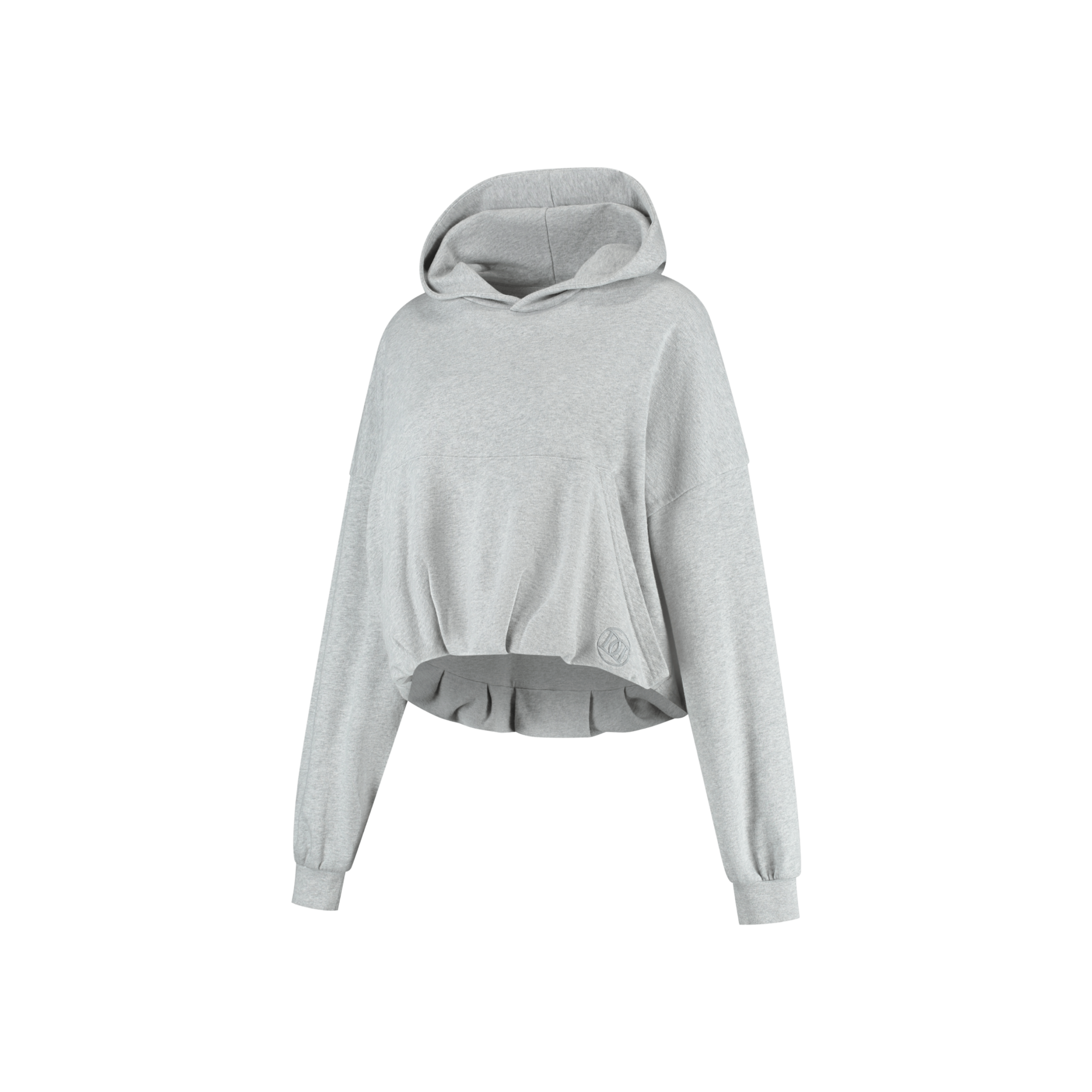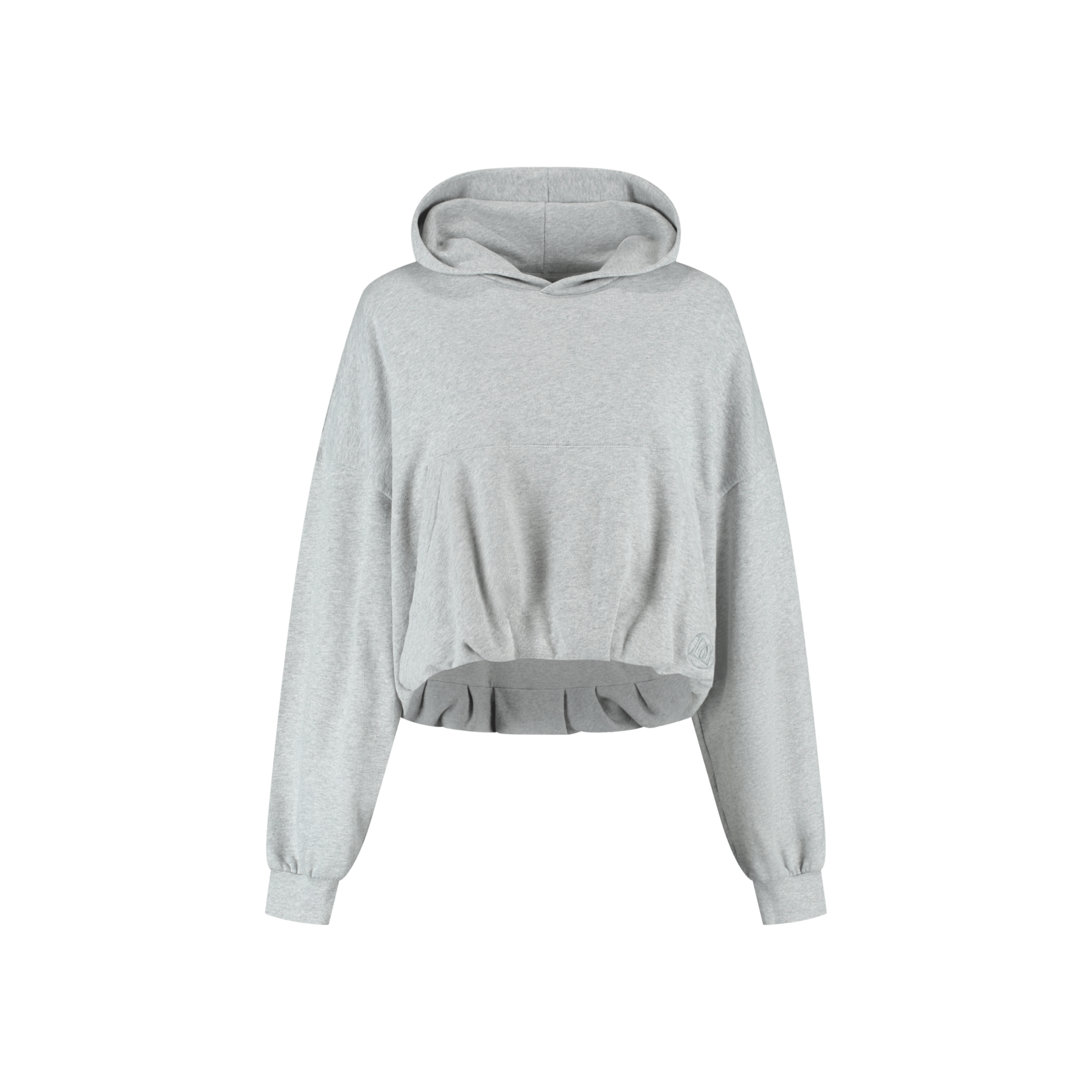 Sweater gemaakt van een combinatie van katoen en polyester, uitgevoerd in een grijze kleur. Het model is cropped en heeft een puffed effect bij de taille, wat zorgt voor een balloon fit. De trui heeft zakken aan de voorkant en capuchon. Het model valt oversized