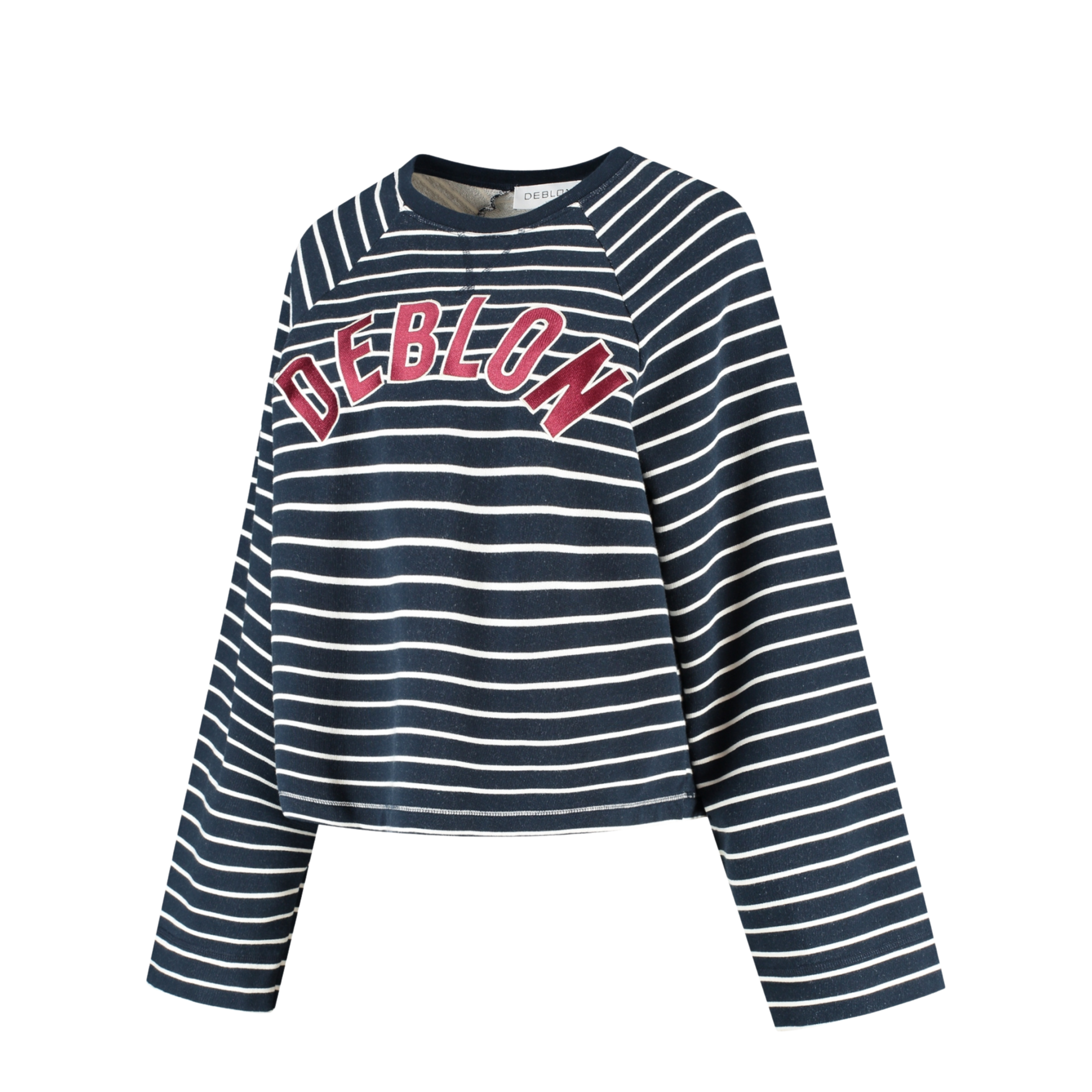 Blauwe sweater met witte strepen. Deze trui heeft een oversized fit en is gemaakt van 100% katoen. Opvallend aan de trui zijn de rode Deblon letters op de voorkant van de sweater. Perfect te combineren met de Dani short.