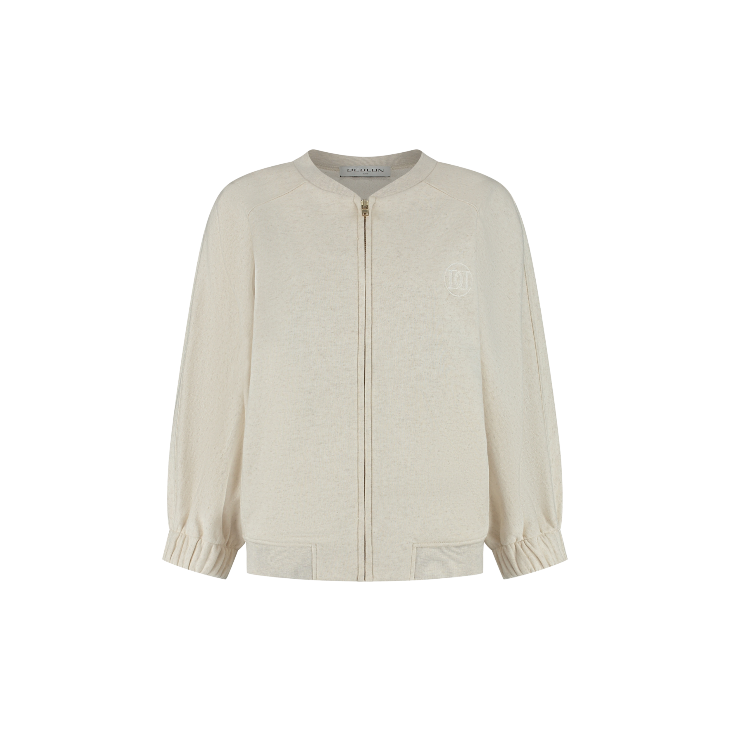 Vest gemaakt van 100% katoen, uitgevoerd in een beige kleur. Het vestje is zacht en super comfortabel, met wijde mouwen die vallen tot boven de pols. Hij heeft een ronde hals en ritssluiting. Op de borst zit nog het Deblon logo geborduurd in dezelfde kleur. Combineer hem met de Fia jogger voor een comfortabele outfit.