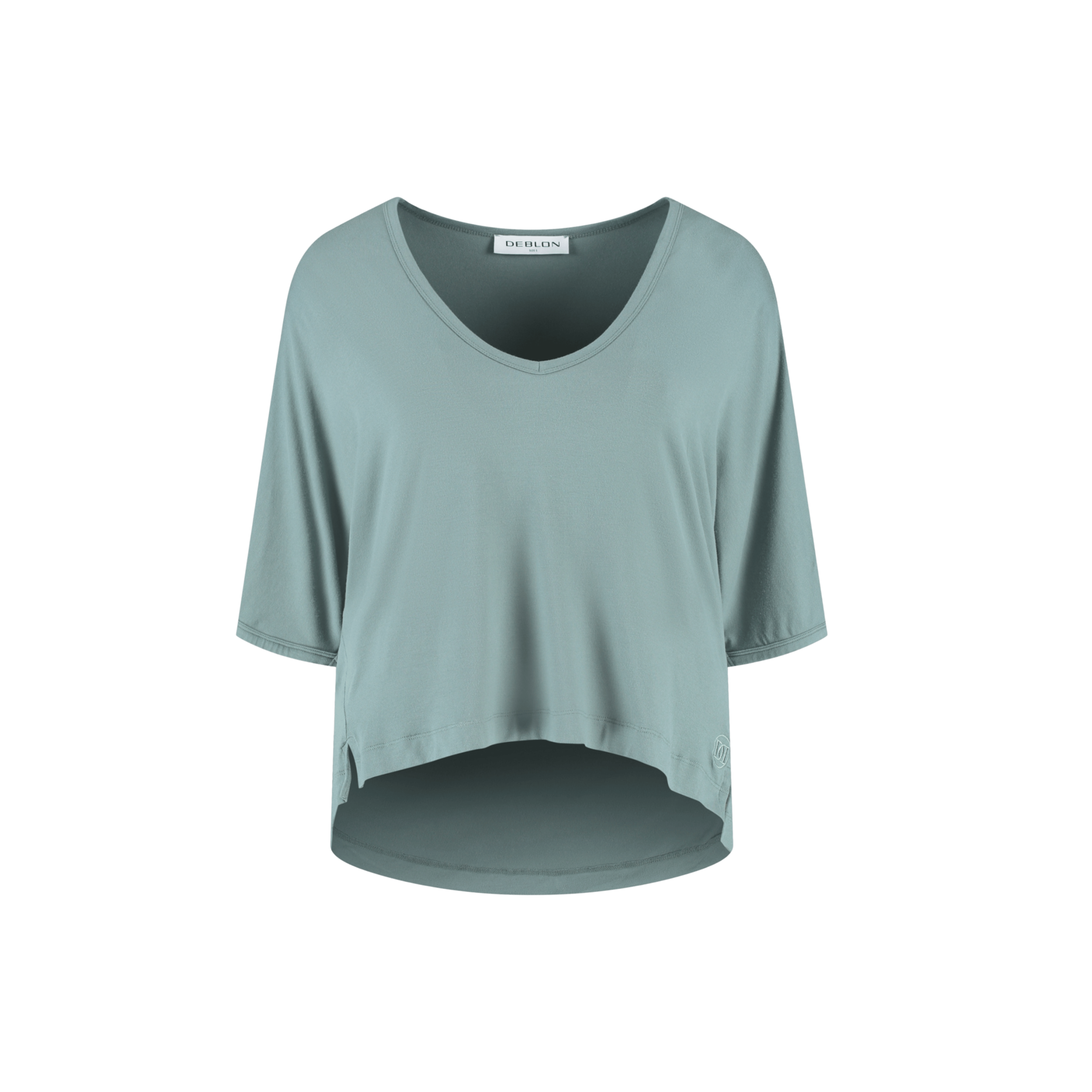 Dit shirt, gemaakt van 95% viscose en 5% elastine is uitgevoerd in een sage groene kleur. Hij heeft een v-hals en wijd uitlopende mouwen tot over de elleboog. De voorkant valt korter als de achterkant en aan de zijkant zitten kleine splitjes.