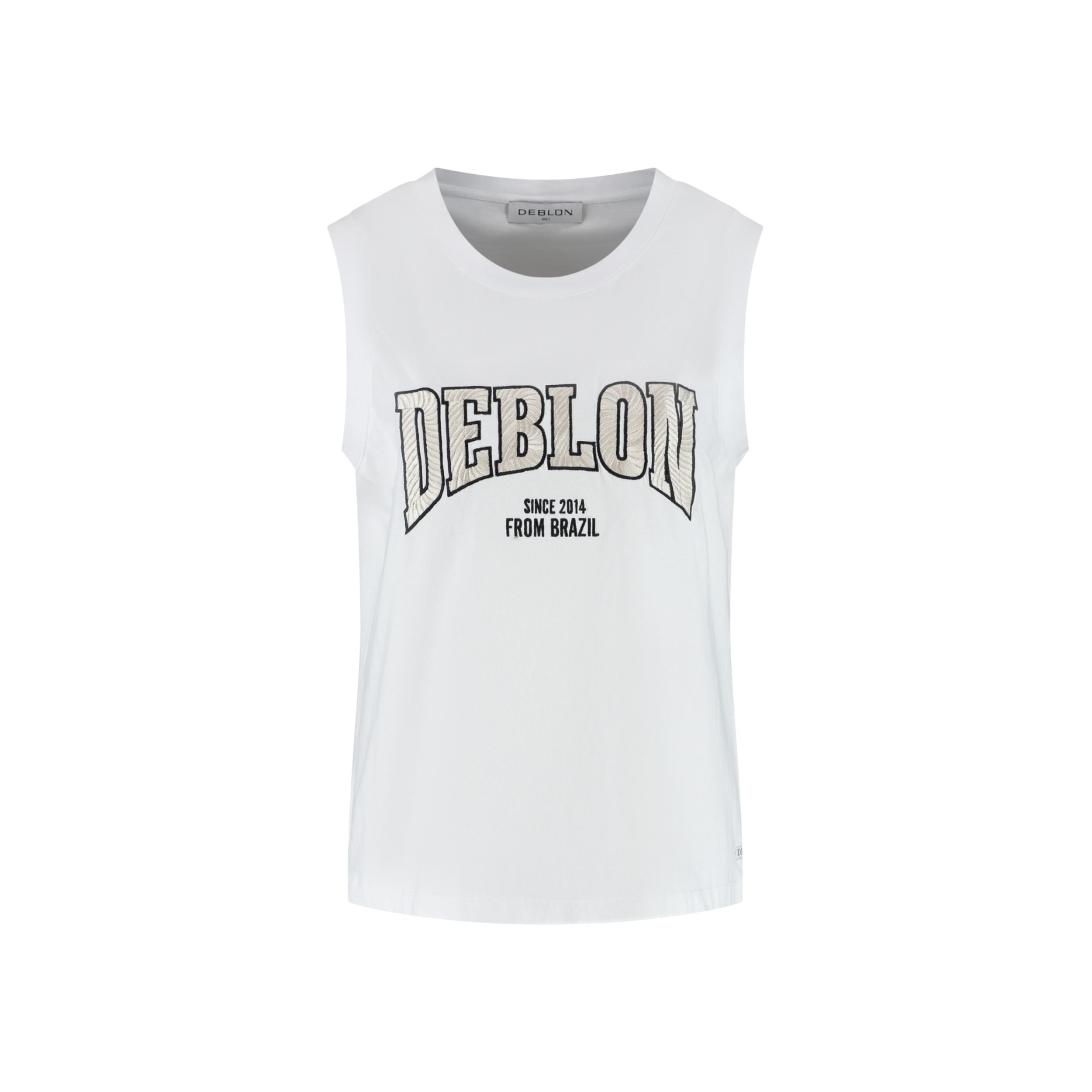 Mouwloze top, gemaakt van 100% Katoen. Deze mouwloze top met ronde hals is perfect voor de zomer. Hij is uitgevoerd in een witte kleur en heeft een Deblon print op de voorkant. De randen van de mouwen en de hals hebben een brede boording. Het shirt valt wijd.
