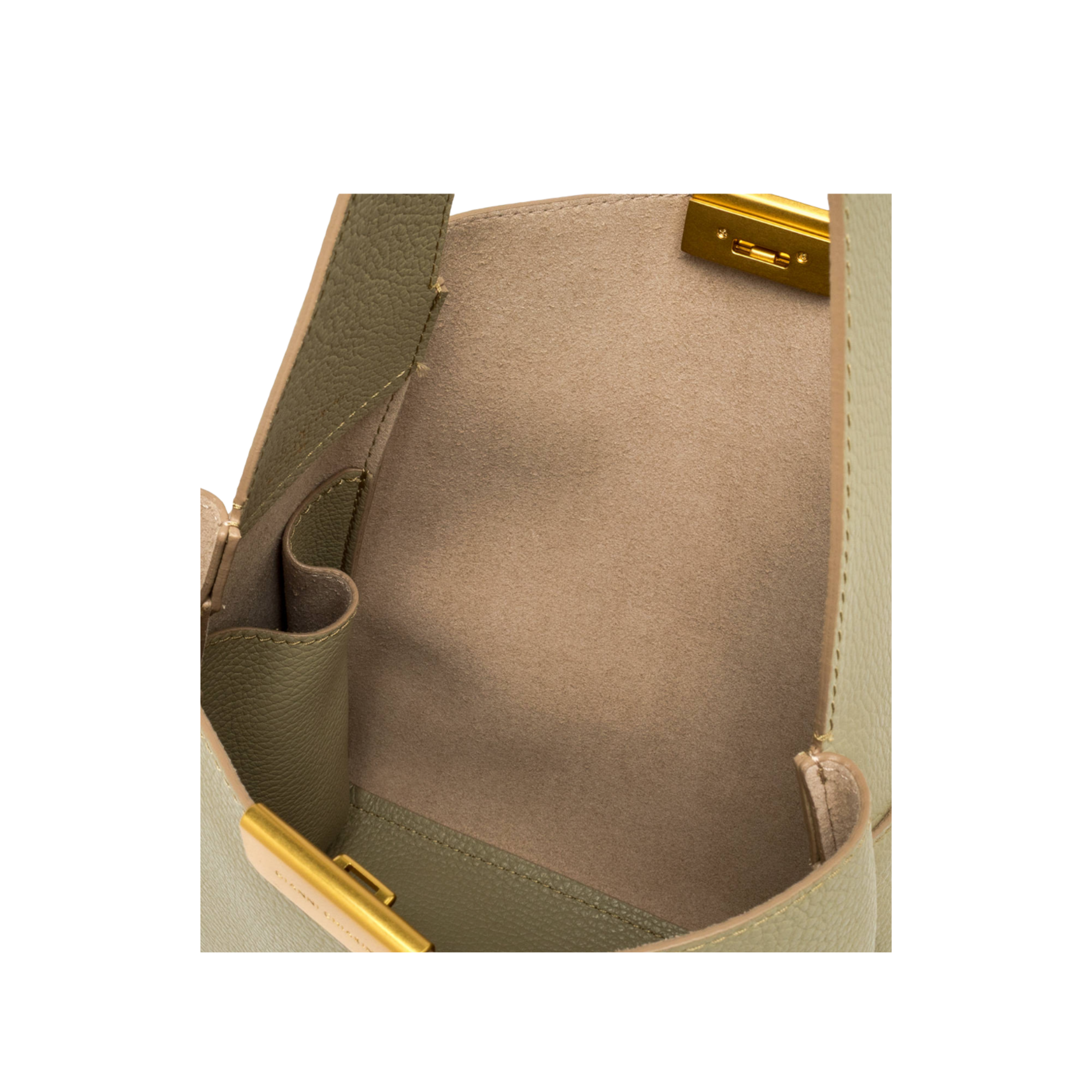 Deze tas is gemaakt van zacht leer. Hij heeft een licht groene kleur, ideaal te combineren voor het komende seizoen. De tas heeft een bucketvorm en verstelbare schouderstrap. Opvallend aan de tas is de metalen sluiting in een gouden kleur. Aan de binnenkant van de tas zit 1 groot vak en 2 flessenhouder vakken voor praktisch gebruik.