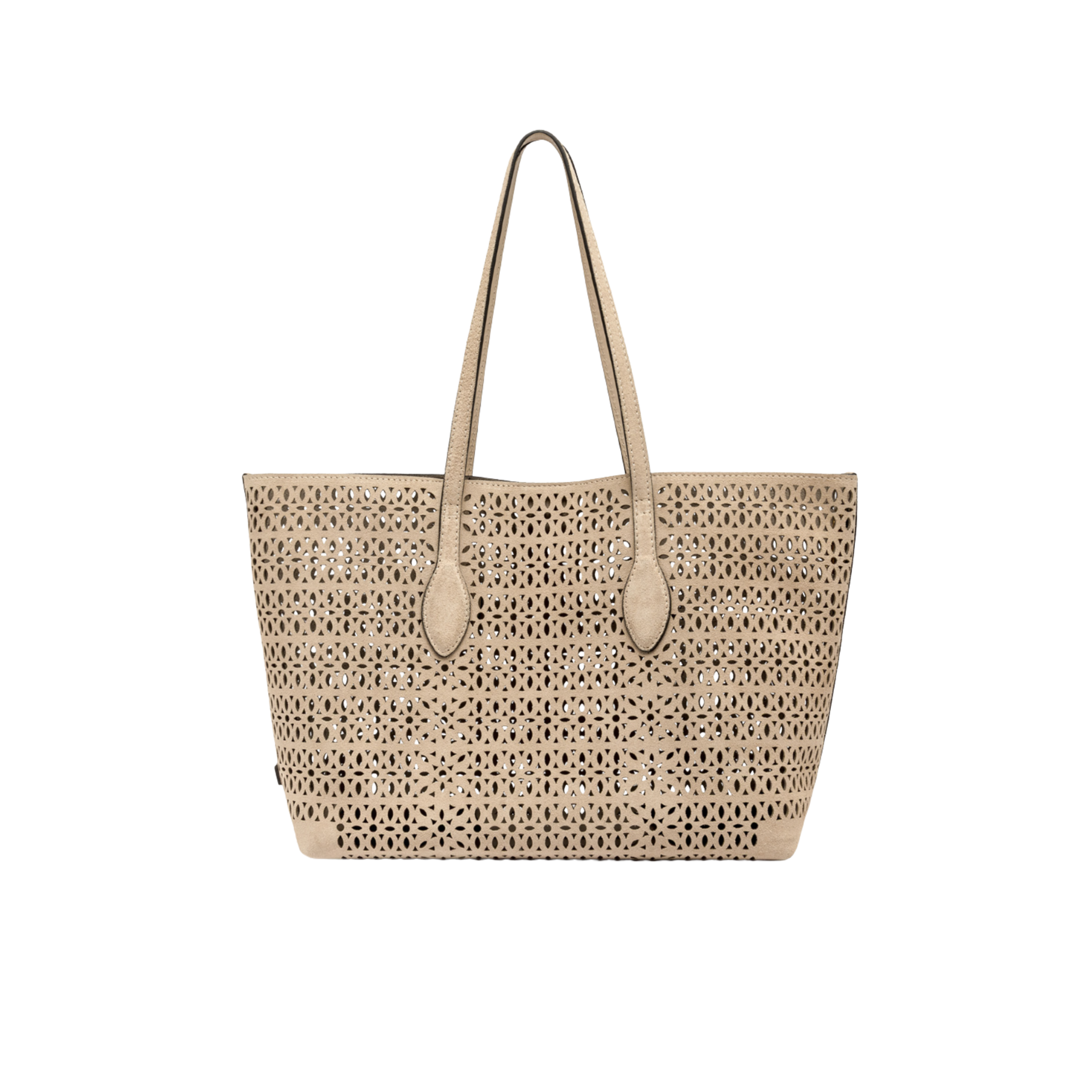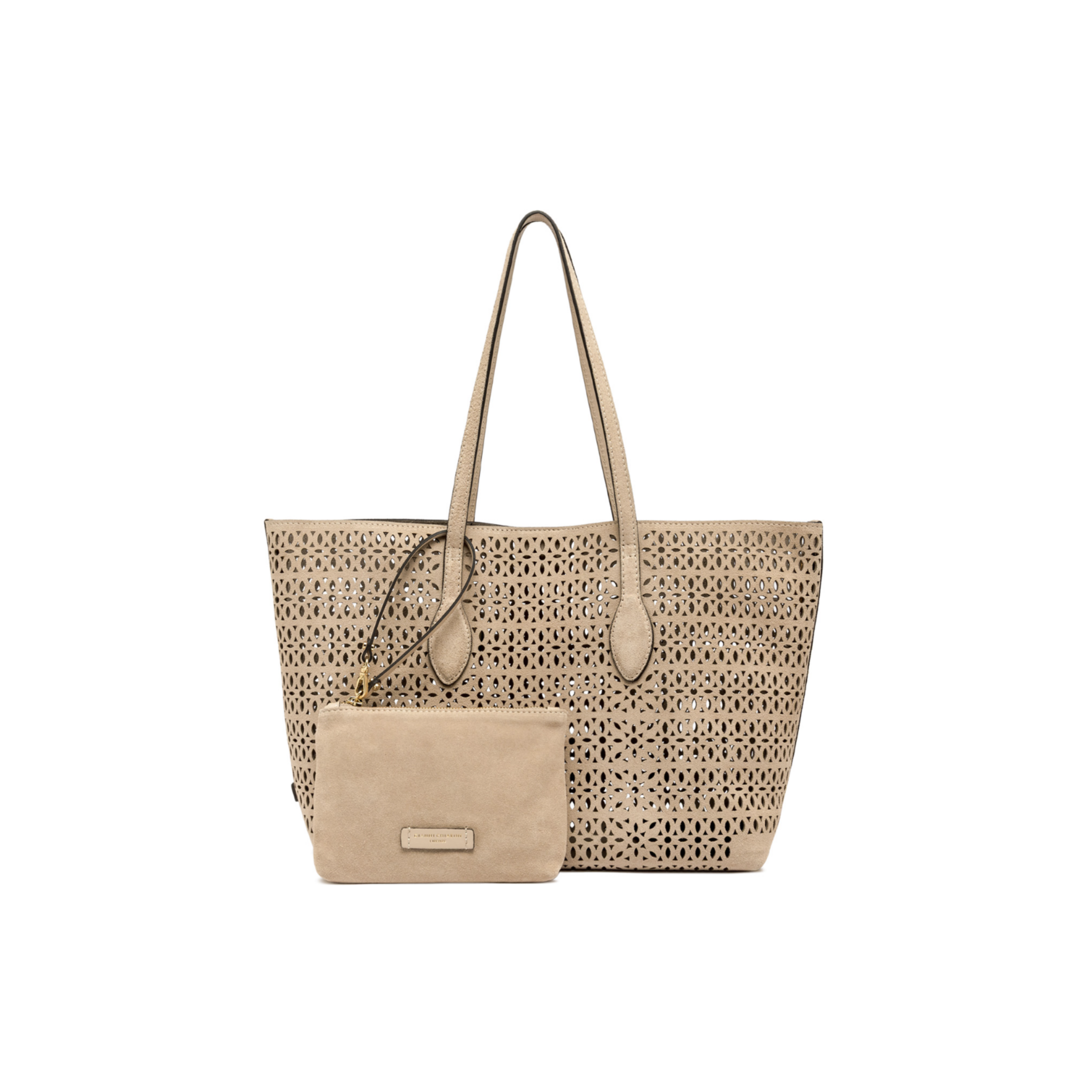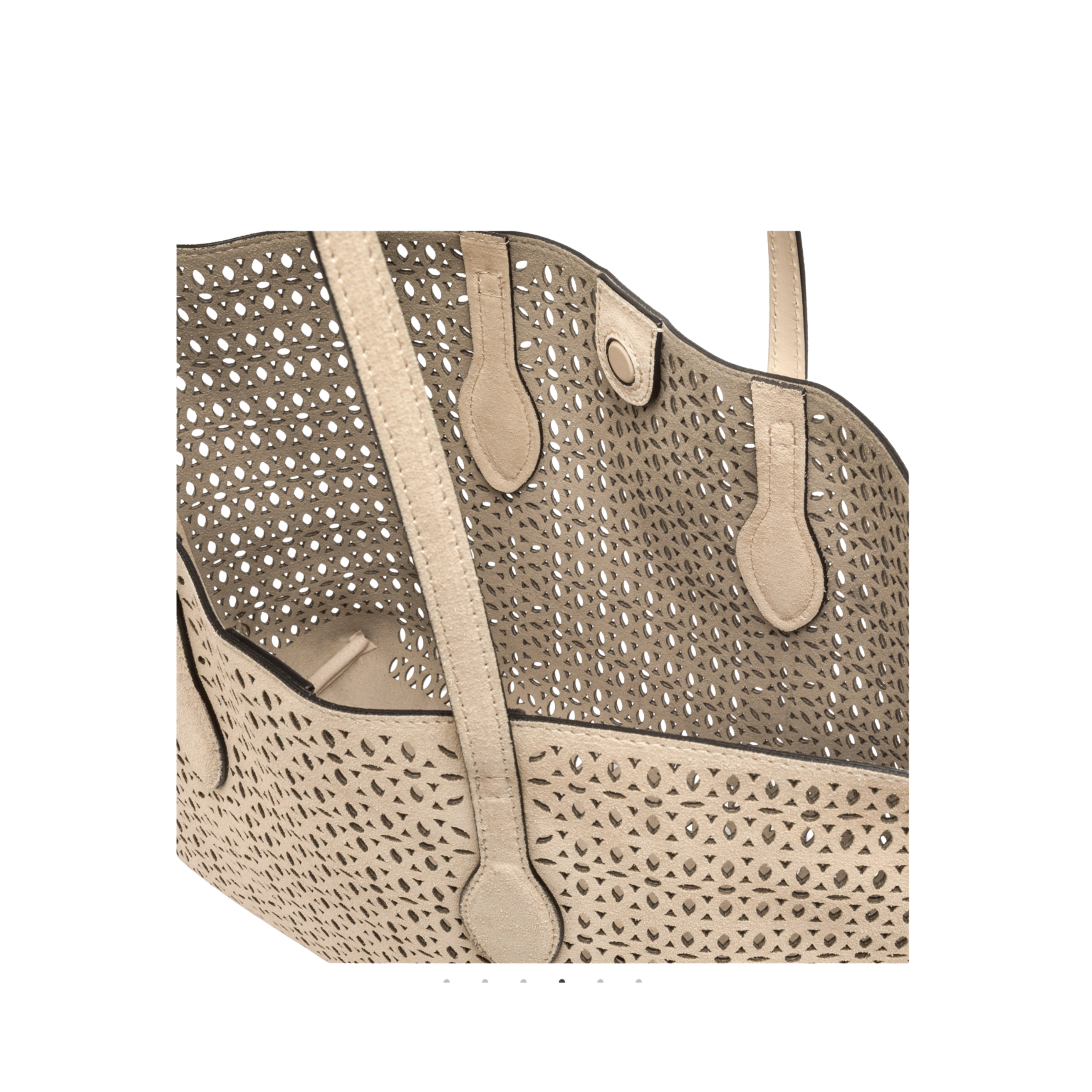 Deze shopper is gemaakt van suède en heeft een patroon met later-cut effect in de stof, wat een geperforeerd design geeft. De tas sluit met magnetische drukknoop sluiting en wordt geleverd met een bijpassende clutch.