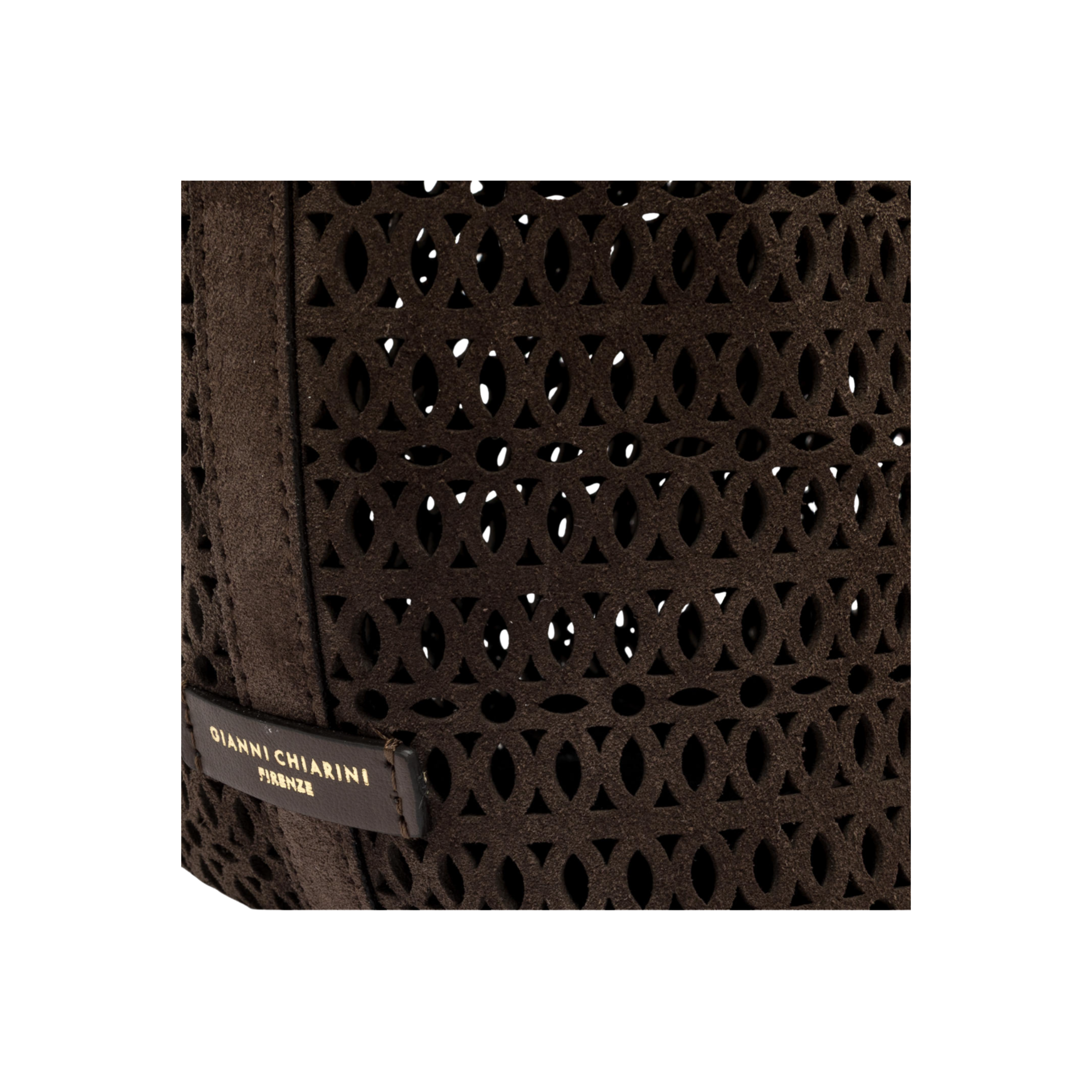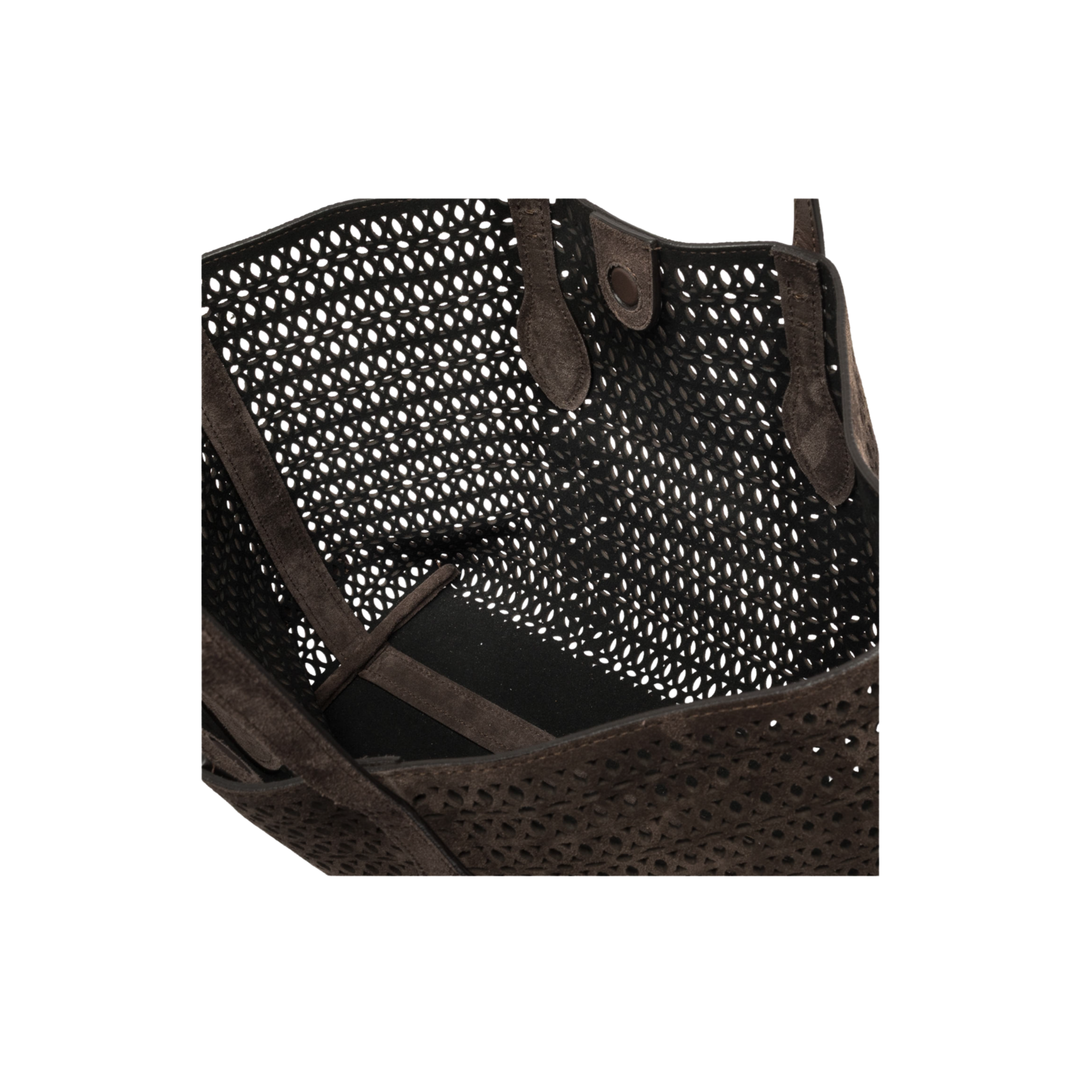 Deze shopper is gemaakt van suède en heeft een patroon met later-cut effect in de stof, wat een geperforeerd design geeft. De tas sluit met magnetische drukknoop sluiting en wordt geleverd met een bijpassende clutch.