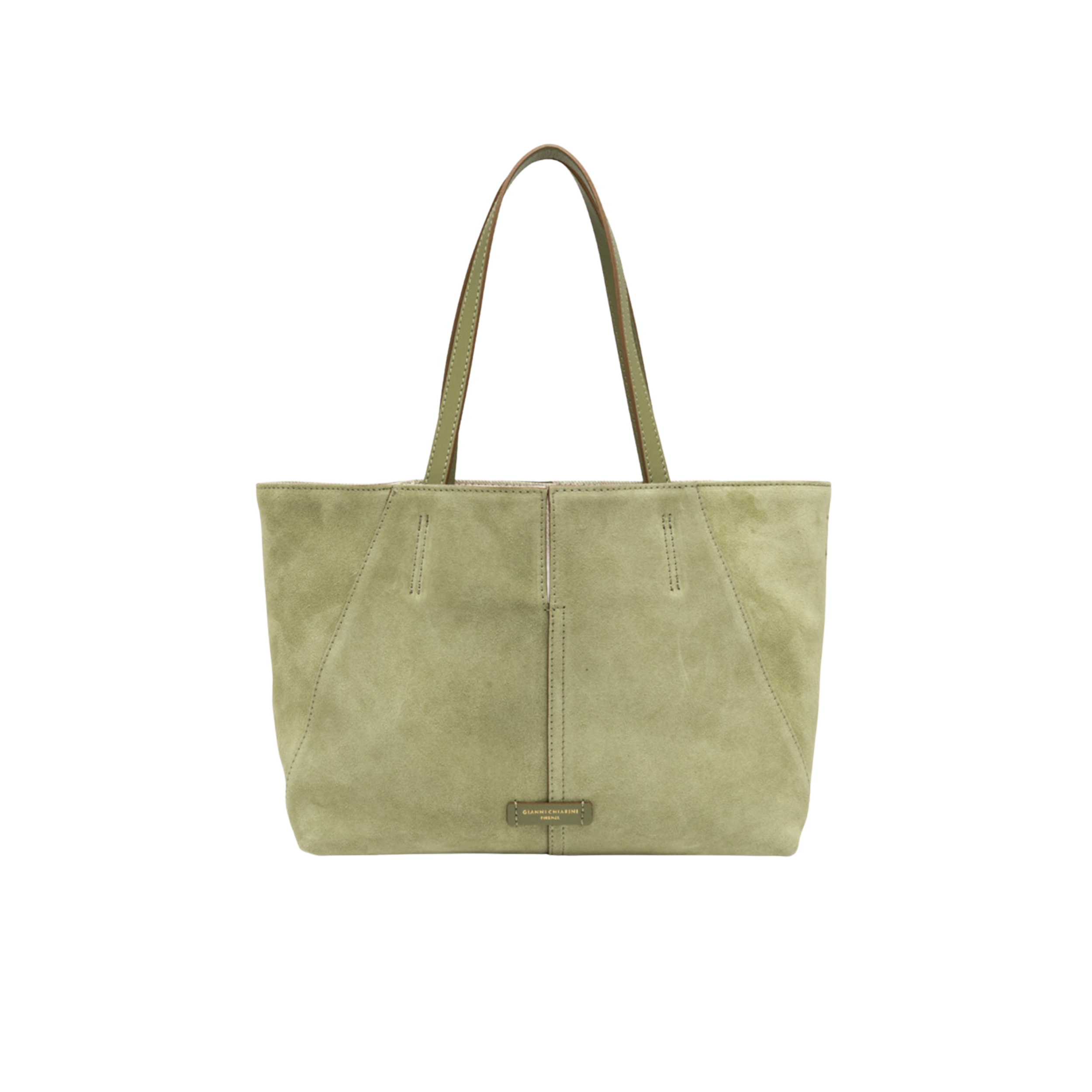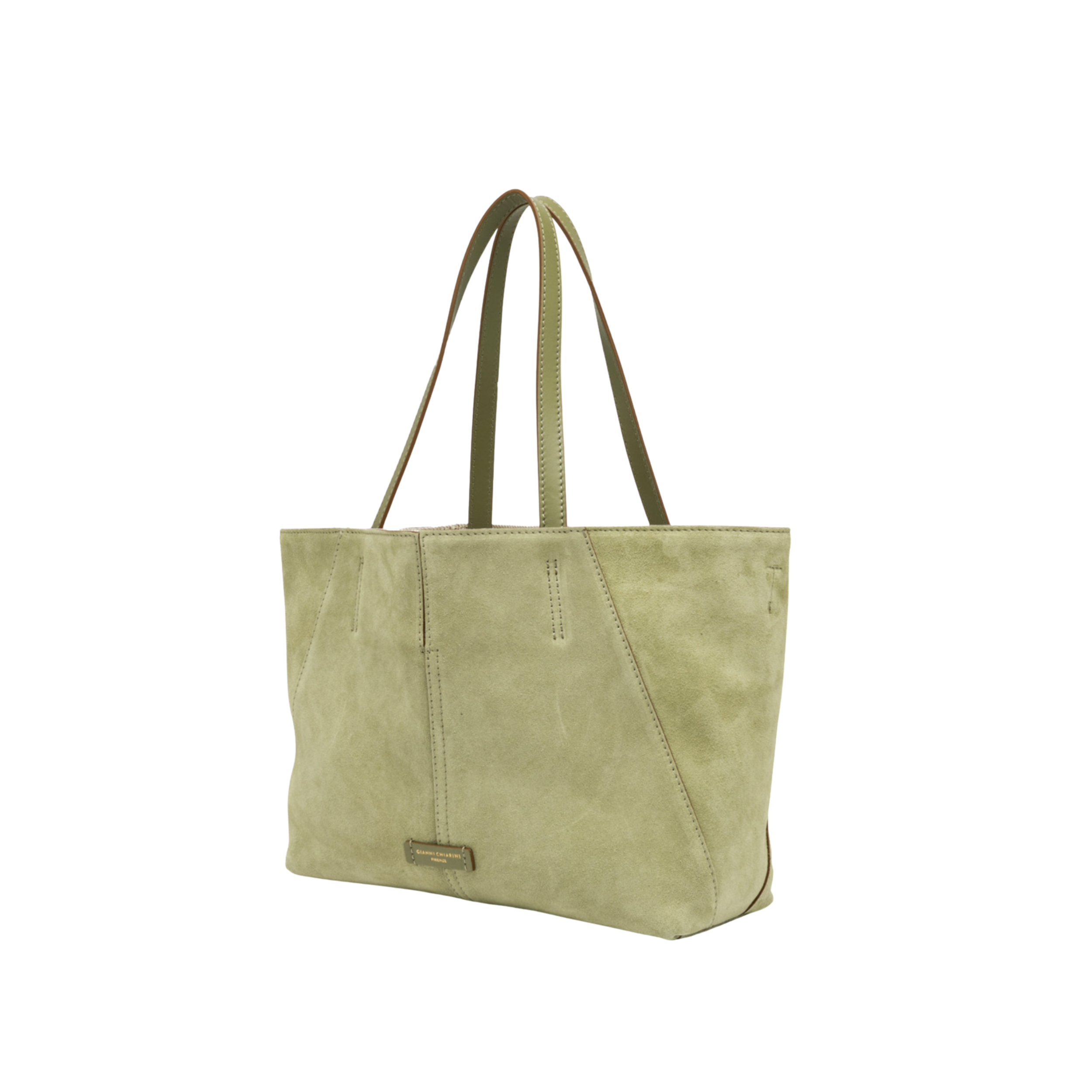 Deze tas, gemaakt van een zachte suède, heeft een prachtige lichtgroene kleur voor de komende seizoenen. De stitching is contrasterend. De hoeken van de tas kunnen worden ingevouwen voor een compleet andere look. Een ideale shopper.