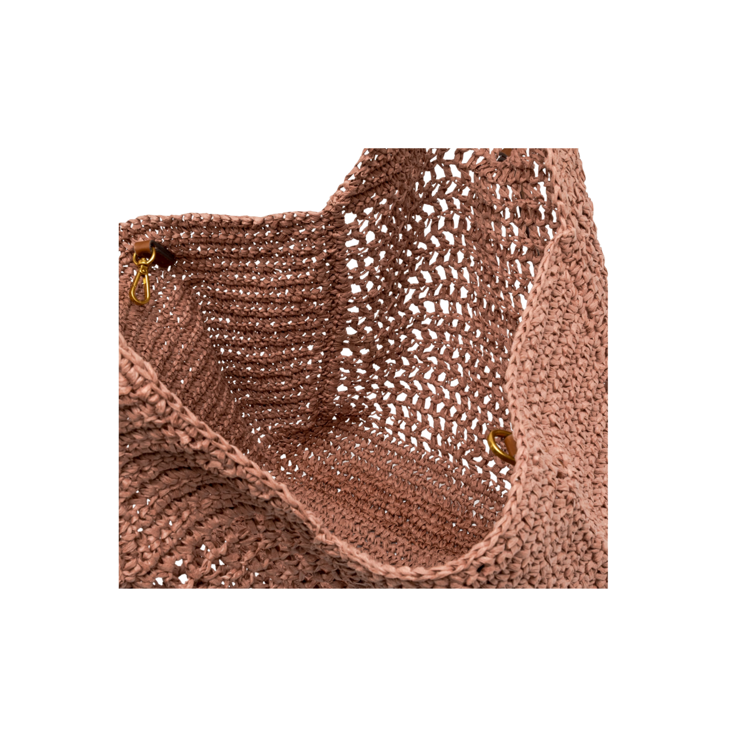 Deze tas is perfect voor de warmere dagen. Hij is gemaakt van gehaakt stro en heeft een oudroze kleur. De tas sluit met een donkerbruin, leren trekkoord, wat de tas nog een extra detail geeft.