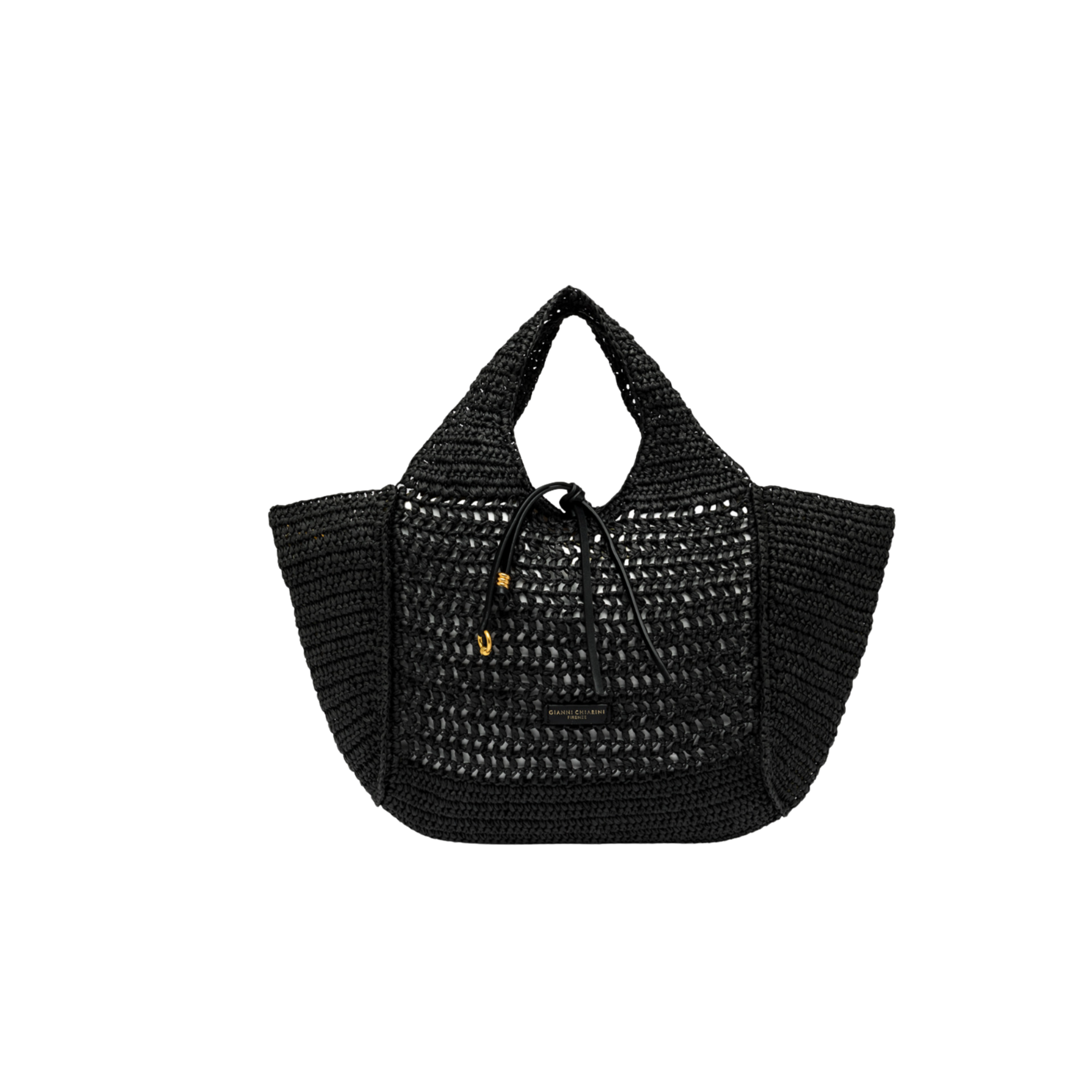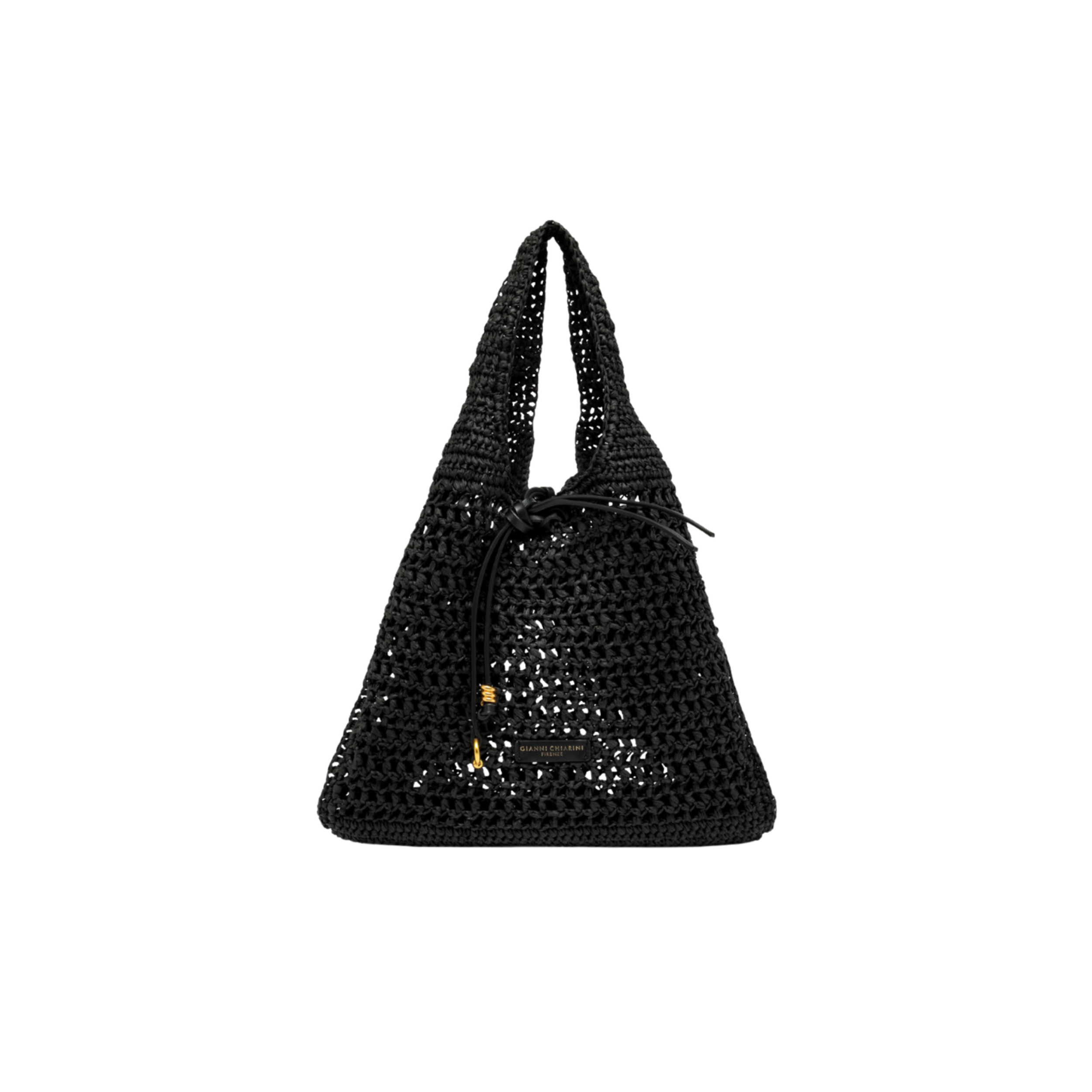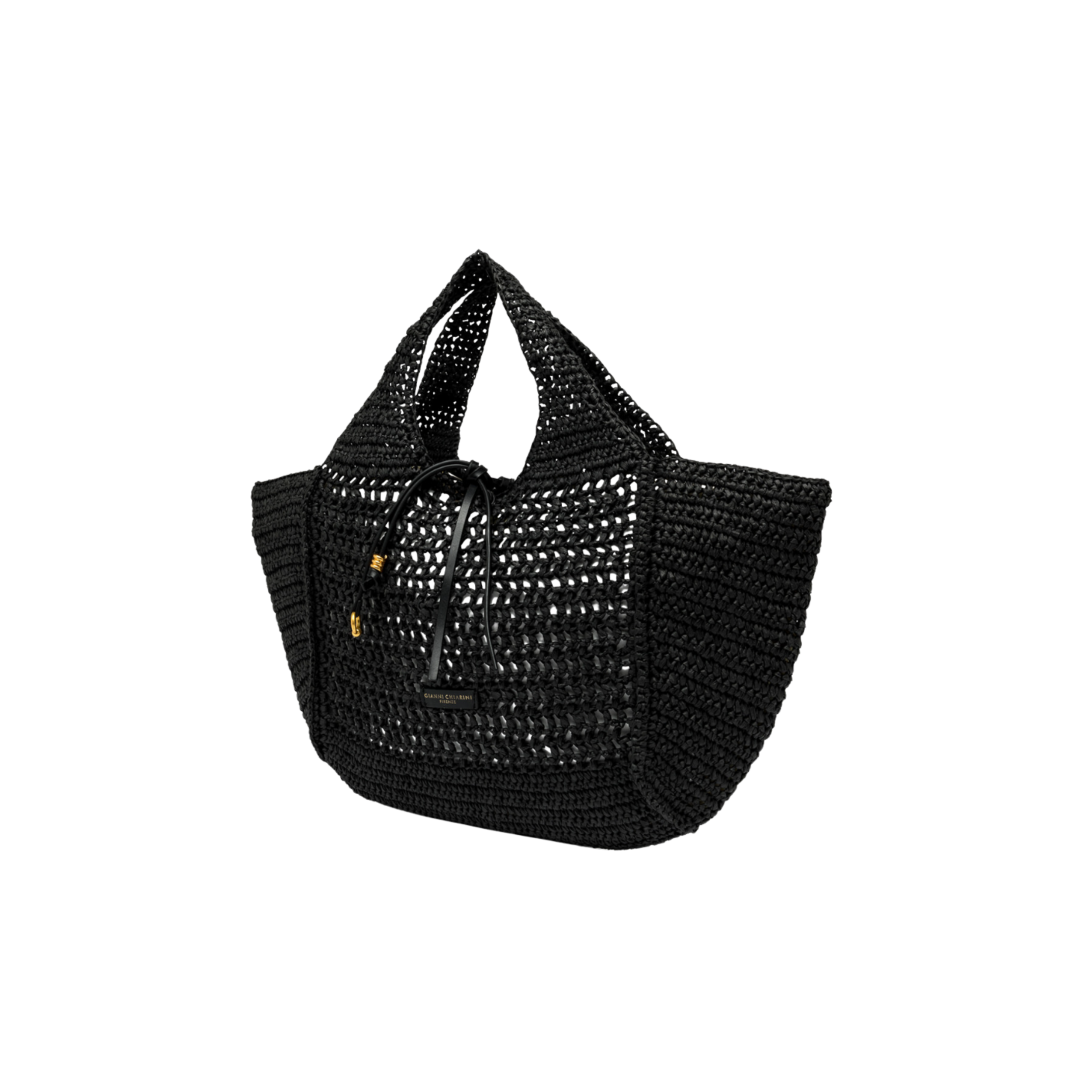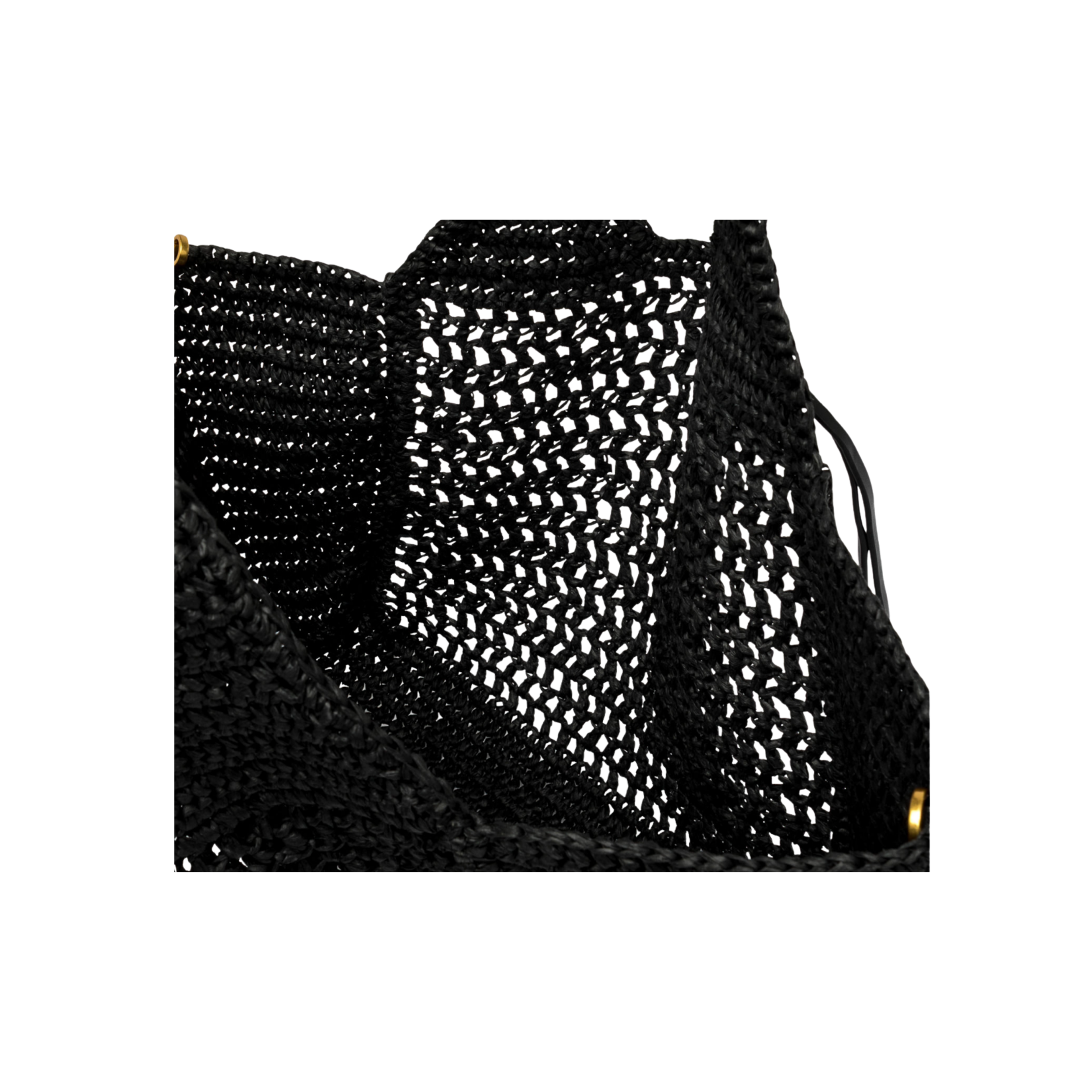 Deze tas is perfect voor de warmere dagen. Hij is gemaakt van gehaakt stro en heeft een zwarte kleur. De tas sluit met een zwart, leren trekkoord, wat de tas nog een extra detail geeft.