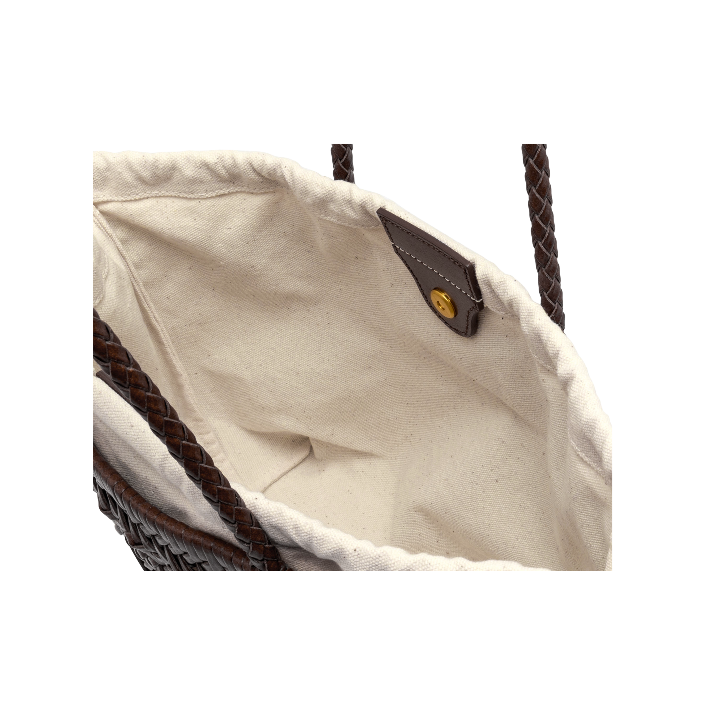 Deze tas, gemaakt van leer, is uitgevoerd in een donkerbruine kleur. De tas heeft een gevlochten look met verschillende leren patronen over de tas. De tas heeft een binnentas in een beige kleur, deze sluit met trekkoord sluiting en magnetische drukknoop sluiting. De tas is afgewerkt met bruine pom poms.