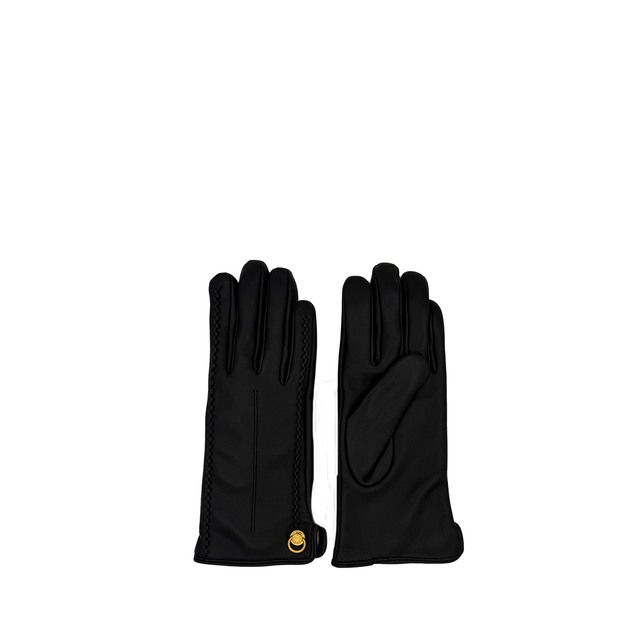 Deze handschoenen zijn uitgevoerd in zwart leer. Het model heeft een detail van stiksel en een enkele gouden stud op de voorkant. De binnenkant is gevoerd met 100% wol.