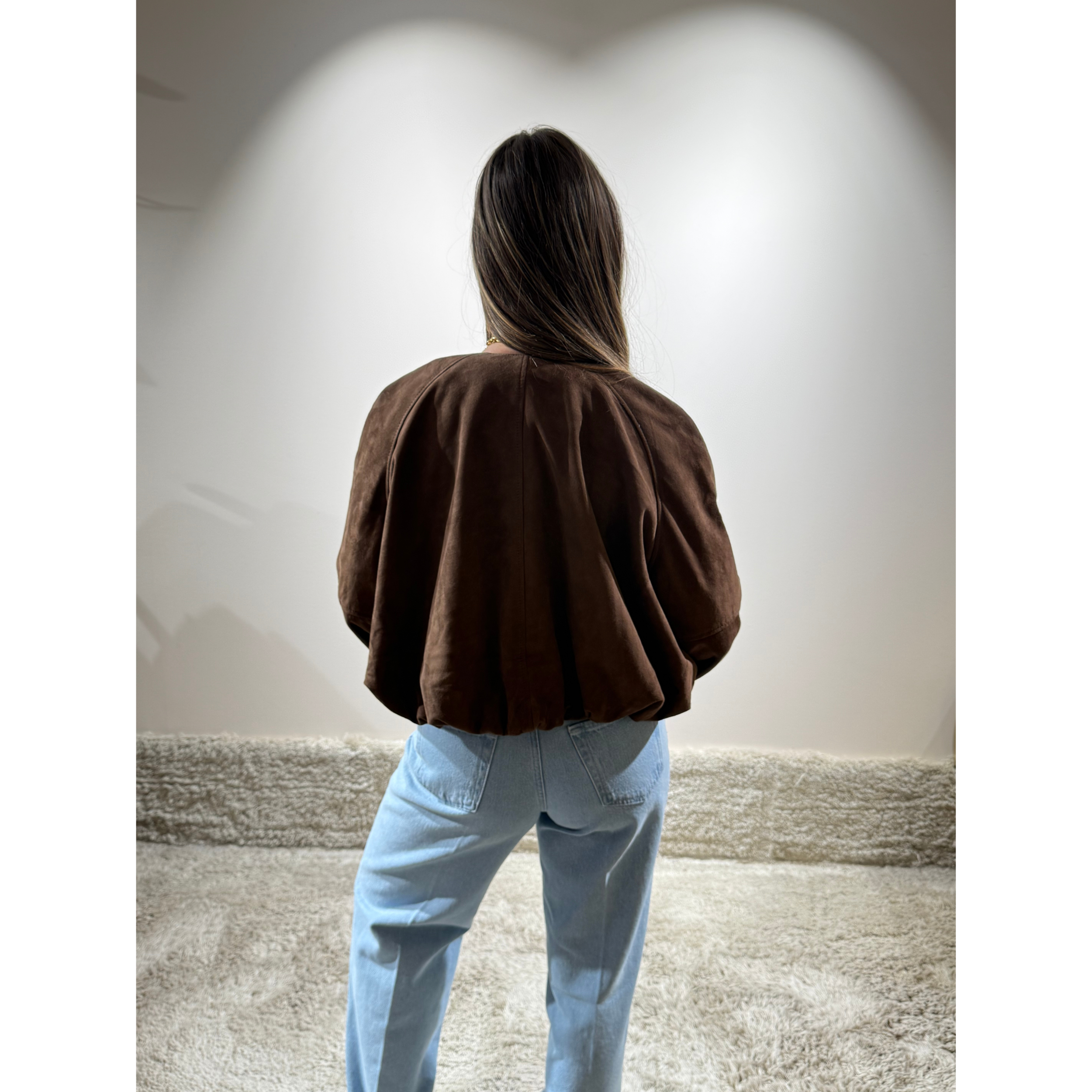 Jas, uitgevoerd in zacht suède, met een ronde hals. De jas heeft knoopsluitingen en valt normaal. Aan de achterkant heeft de jas een plooiend effect.