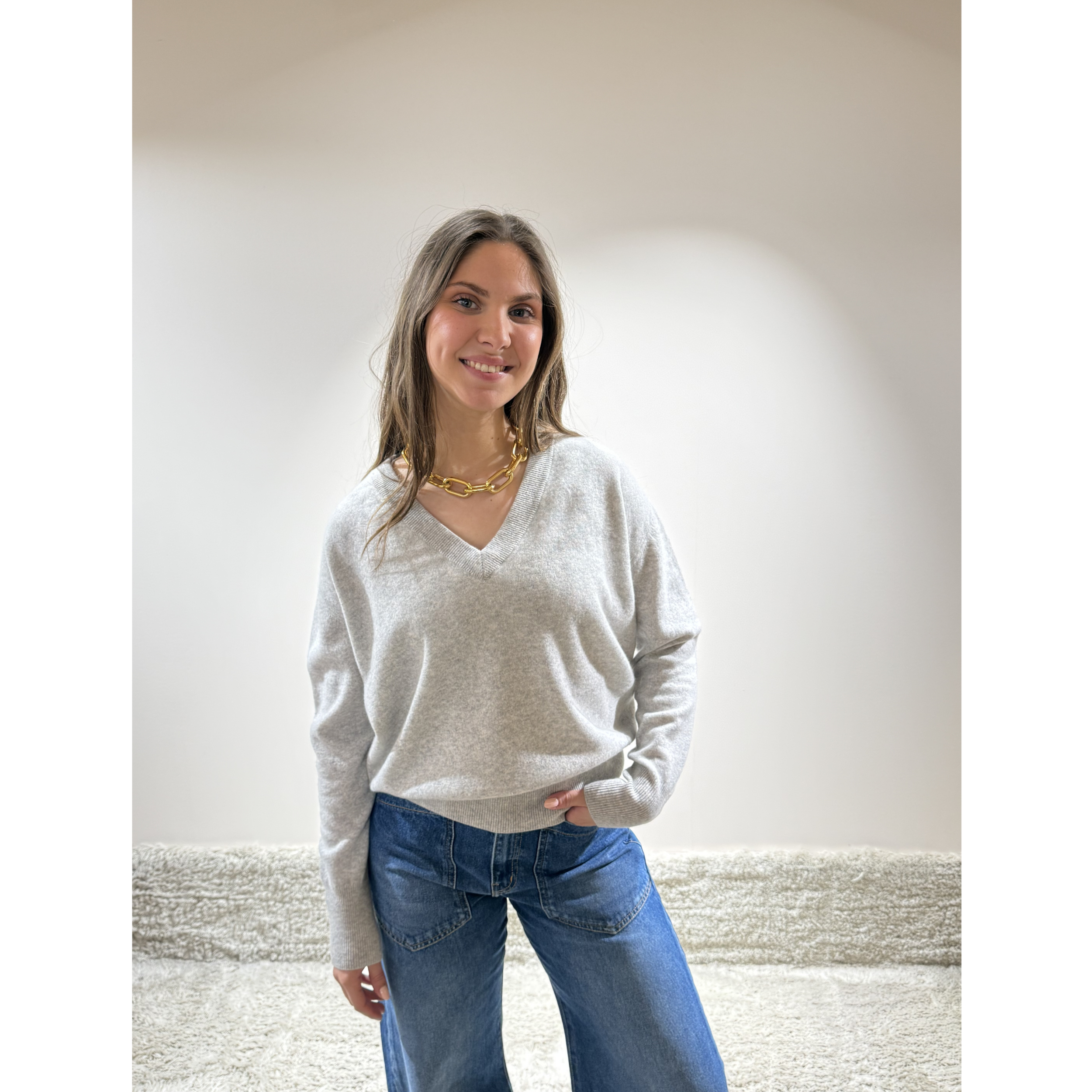 Cashmere trui met een v-hals, uitgevoerd in een grijze kleur. De trui heeft een dikke, geribbelde hals en geribbelde boording bij de mouwtjes. Een perfecte, tijdloze trui!