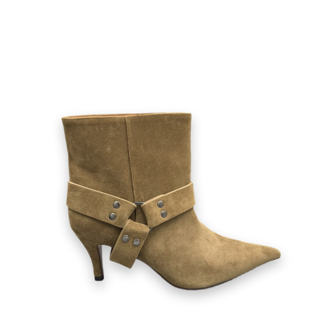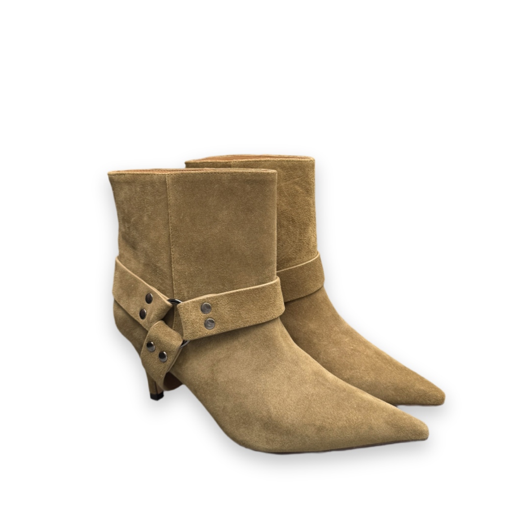 Deze korte laars met kleine hak is uitgevoerd in een zachte suède. De laars heeft een kleine hak en een puntige neus. Hij valt op door de riem aan de zijkant van de laars, wat de laars net een extra detail geeft. De hakhoogte is 7 cm.