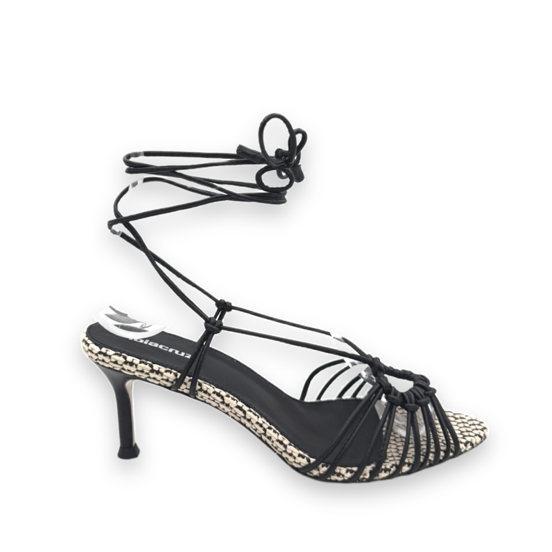 Deze pump is gemaakt van leer en heeft een opvallend design. De hak heeft een ronde puntneus en heeft een gevlochten patroon op de bovenkant van de voet. Ook om de enkel zitten trouwtjes die geknoopt kunnen worden. Het voetbed heeft een zwart met beige afwerking voor een extra detail. De hakhoogte is 5 cm.