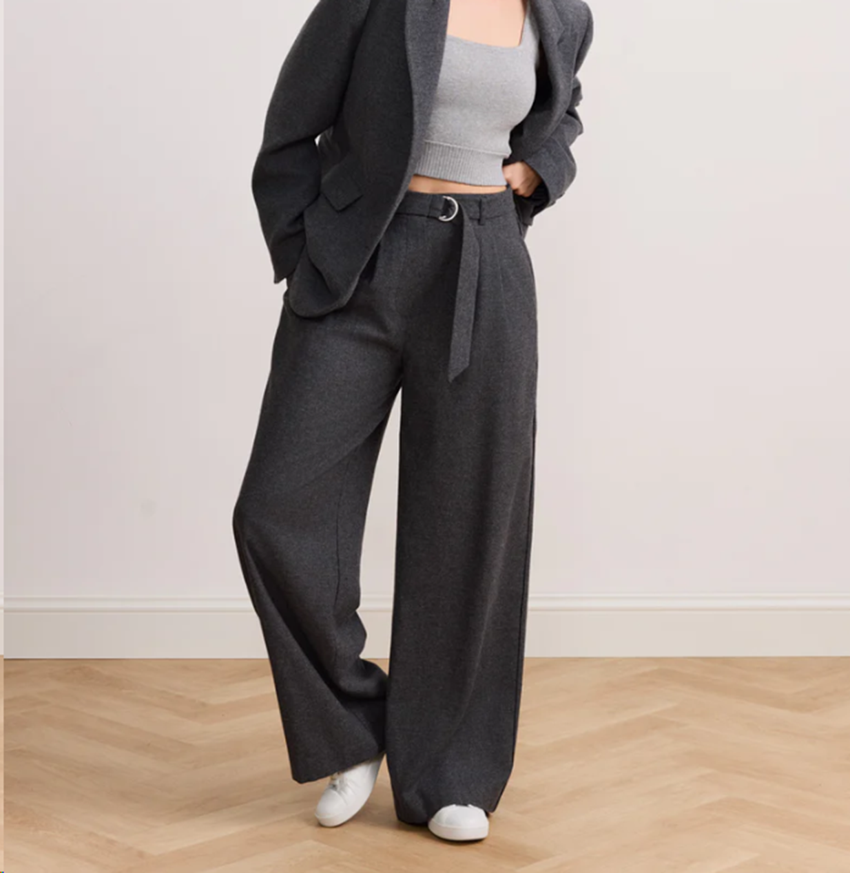 Deze grijze wide-leg broek is uitgevoerd in grijs polyester gemengd met wol en viscose. Het model heeft een oversized fit en een losse ceintuur.